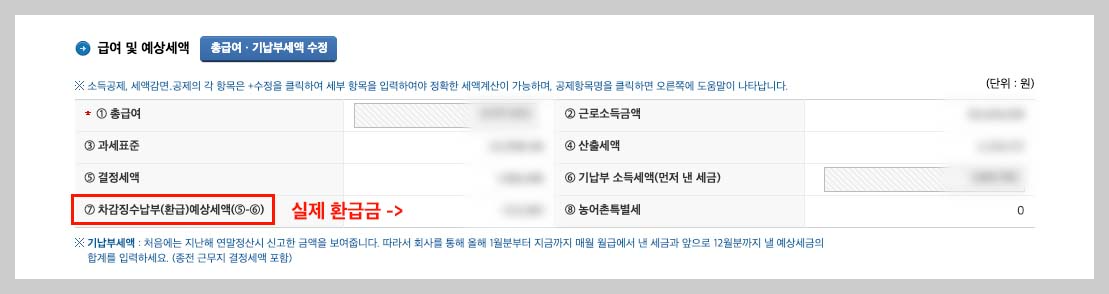 앞서 설명드린 과정을 캡처 화면을 보고 따라 하시게 되면 맨 마지막에 급여 및 예상세액이 나오게 되는데요, 여기서 7번인 차감징수 납부 (환급) 예상세액이 바로 여러분이 연말정산으로 돌려받을 수 있는 실제 환급금 금액입니다.
