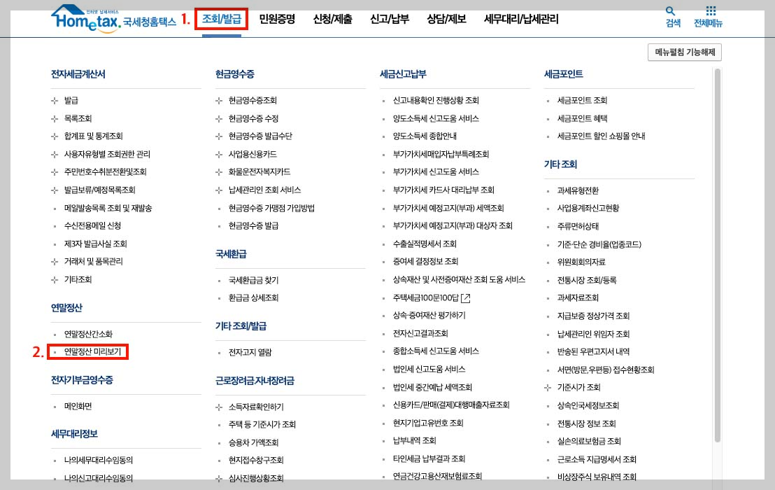 - 상단 메뉴 ► 조회/발급 ► 연말정산 미리보기