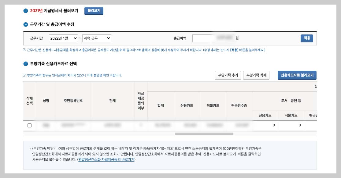 - 2021년 지급명세서 불러오기 ► 신용카드 자료 불러오기 ► 계산하기