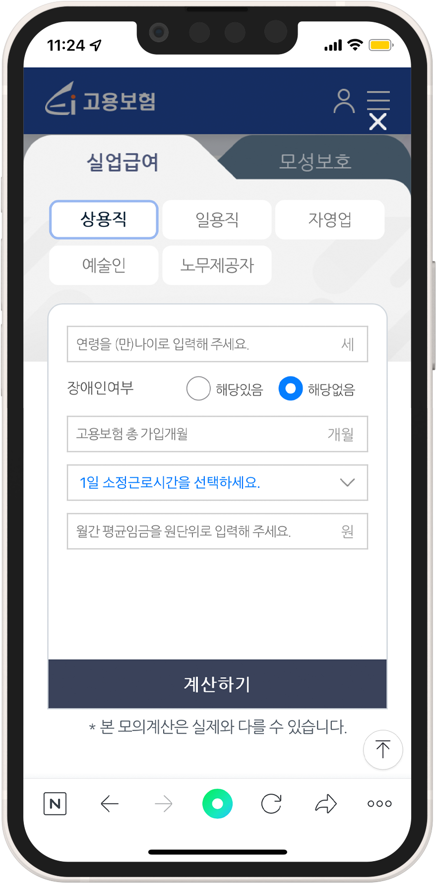 그다음부터는 주어진 정보만 입력하면 실업급여 모의계산이 가능한데요, 본인의 주민등록번호와 장애인 여부, 고용 상품 가입기간을 작성한 뒤 퇴직한 회사에서의 근무 기간과 1일 소정근로시간, 월간 평균임금을 작성해줍니다.
