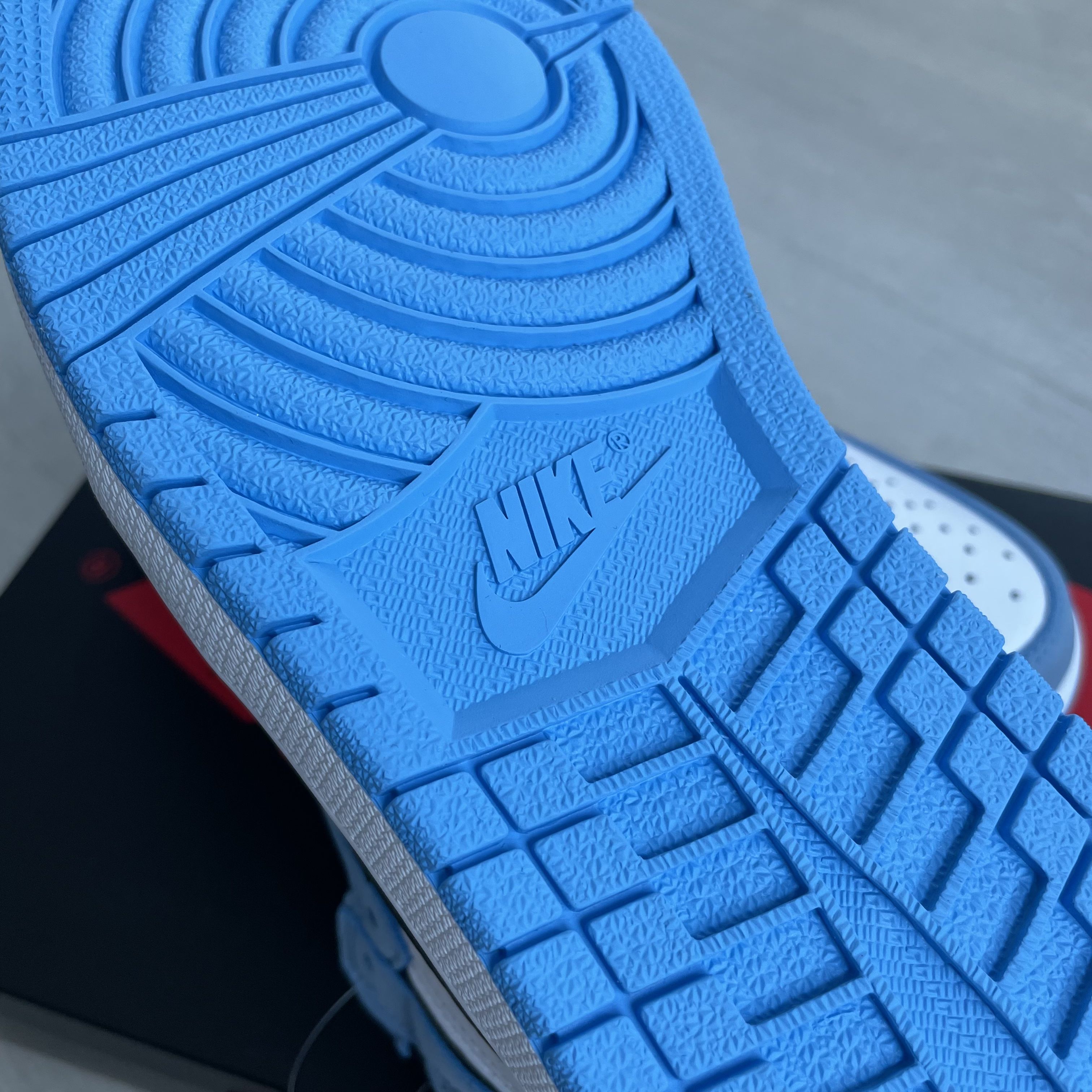 이번엔 아웃솔을 한번 살펴볼게요. 윗부분의 유니버시티 블루보다는 좀 더 진한 컬러로 처리되어 있는데요, 중앙에는 나이키 스우시 로고가 음각 처리되어 있습니다.