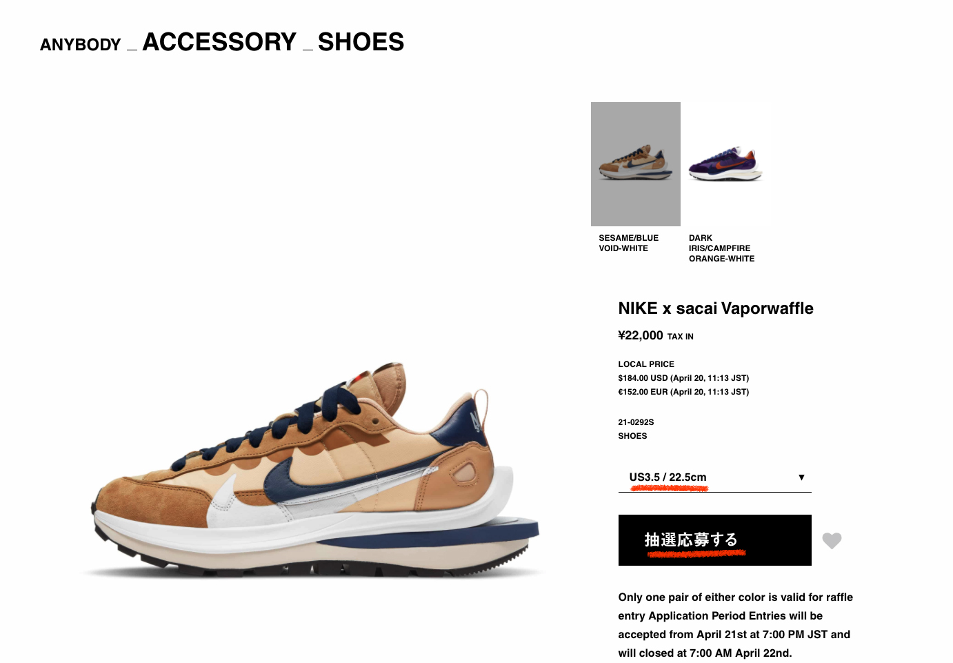 사이즈를 선택했다면 아래 검정 박스에 적힌 일본어를 클릭해주세요. 그러면 나이키 x 사카이 베이퍼와플 응모가 완료됩니다. 단, 사카이 일본 공식 홈페이지에서는 1인 1 컬러만 응모가 가능하기 때문에 신중히 선택 후 응모에 참여해주세요. 이상 나이키 x 사카이 베이퍼와플 일본 공식 홈페이지 응모방법에 대해 알아보았습니다. 감사합니다.