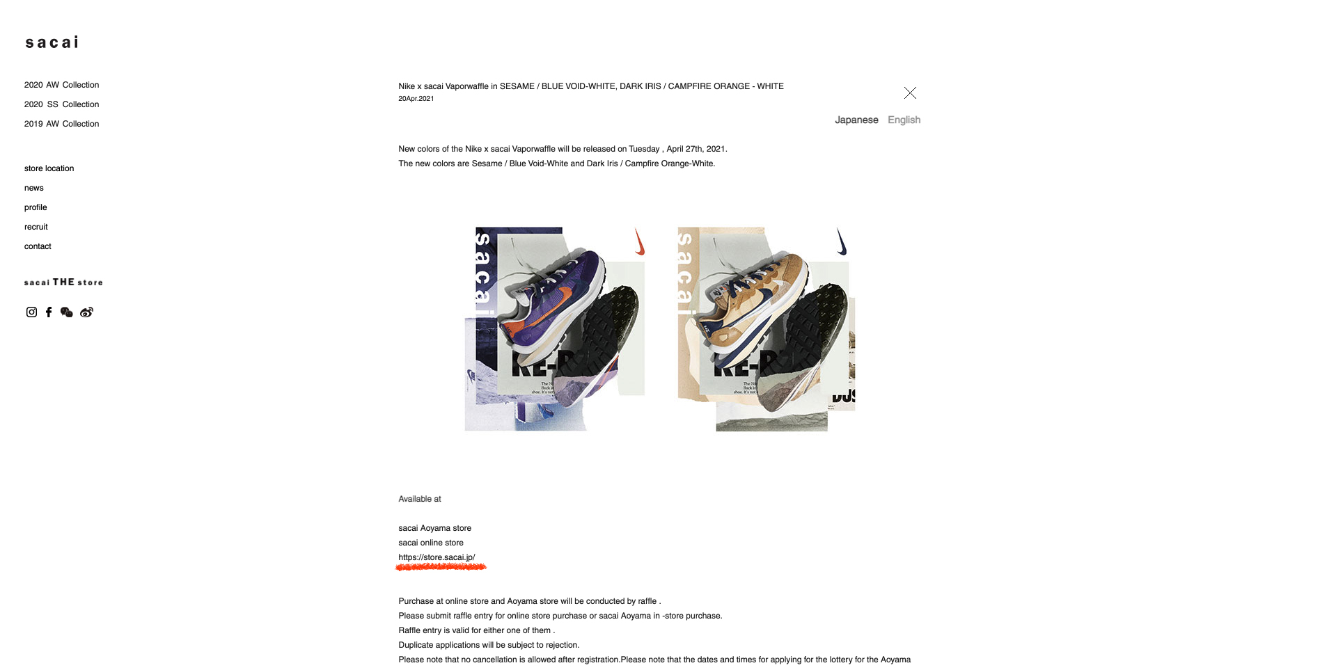 발매 당일 드로우를 진행하는 나이키와는 달리 사카이는 약 일주일 전에 응모를 시작했는데요, 자세한 일정은 아래와 같습니다.