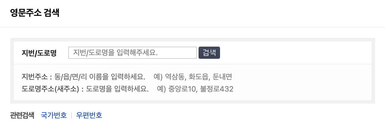 가이드에 맞춰서 개인 정보를 입력해줍니다. 네이버에 '영어 주소'를 입력하면 현재 주소를 영어로 변환해주는 창이 나오는데요, 자신의 주소를 입력하면 영어로 변환된 주소가 나오게 됩니다.