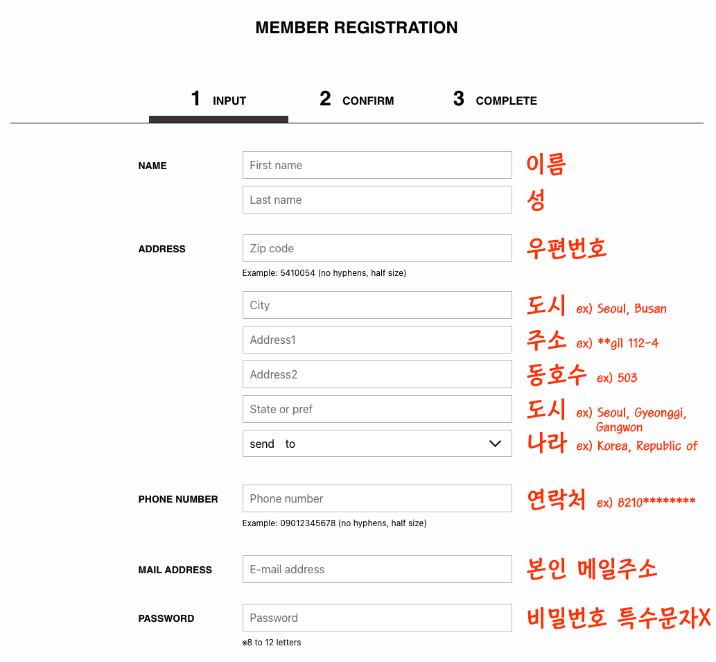 가이드에 맞춰서 개인 정보를 입력해줍니다. 네이버에 '영어 주소'를 입력하면 현재 주소를 영어로 변환해주는 창이 나오는데요, 자신의 주소를 입력하면 영어로 변환된 주소가 나오게 됩니다.