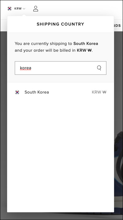 엔드 클로딩은 영국에 위치한 스트릿 편집샵이기 때문에 사이트의 언어는 영어로 되어 있고 가격은 달러로 표기되어 있는데요, 메인 화면 좌측 상단의 국기 버튼을 누르고 'korea'를 검색해서 'south korea'를 선택해줍니다. 그러면 가격에 환율이 적용돼서 원화로 표기되게 됩니다. 하지만 언어는 그대로 영어로 표기되니 참고해주세요.