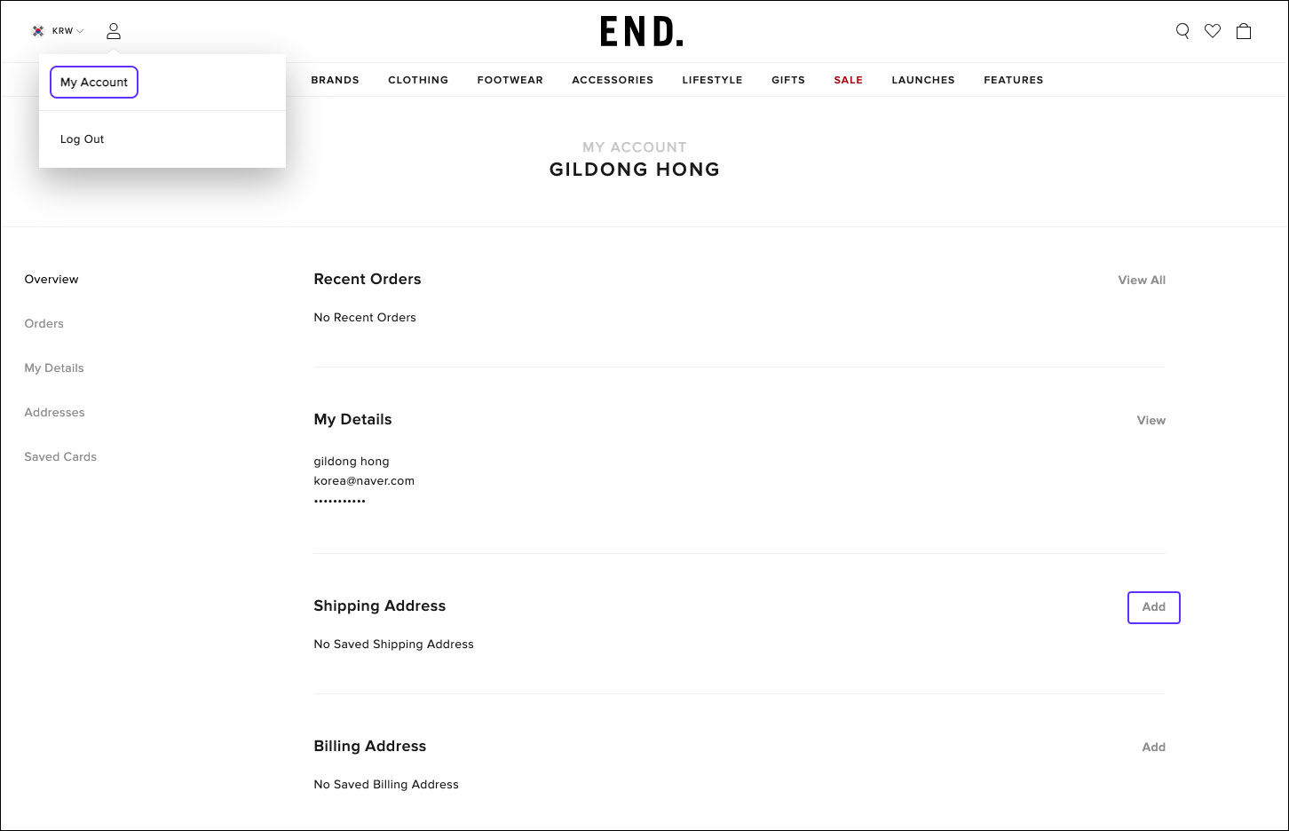 이제 직배송 응모를 위한 배송지 설정을 해줘야 하는데요, 엔드 클로딩 좌측 상단의 사람 모양 아이콘을 누르고 'My Account' 버튼을 한 번 더 눌러주세요.