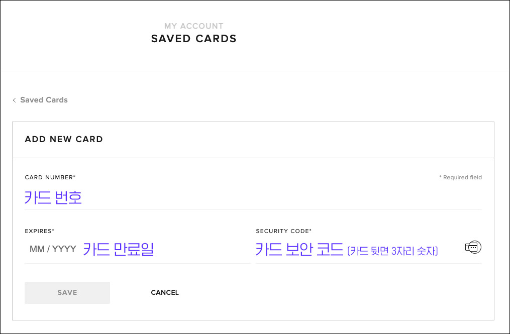 엔드 클로딩 좌측 상단의 사람 모양 아이콘에서 'My Account'를 클릭하면 나오는 화면에서 좌측 메뉴의 'Saved Cards' 버튼을 클릭해주세요. 그럼 본인 소유의 신용카드 정보를 입력하는 창이 나오게 되는데요, 카드 번호와 카드 만료일 그리고 카드 뒷면의 보안 코드 세 자리 숫자를 입력해주고 'SAVE'를 눌러주세요.