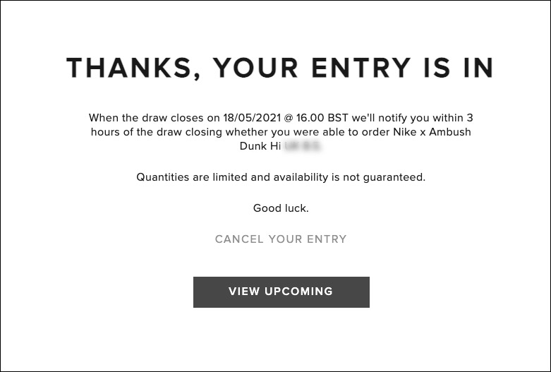 신발 사이즈, 주소, 결제할 카드까지 모두 선택하고 아래 'ENTER DRAW'를 클릭하면 이런 창이 뜨게 되는데요, 2021년 5월 18일 정식 발매가 되고 난 뒤 약 3시간 안에 응모 결과에 대해 메일로 알려준다는 내용과 행운을 빈다는 말이 적혀 있습니다.