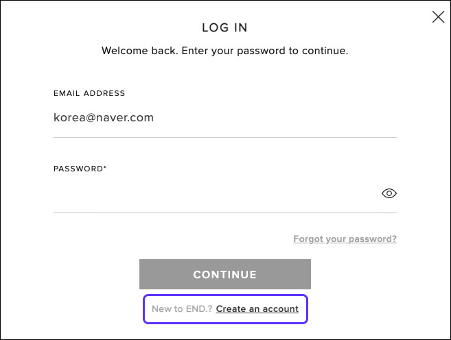 좀 전에 엔드 클로딩 메인 화면의 좌측 상단에서 국가를 선택해줬죠? 국기 바로 오른쪽에 있는 사람 모양의 아이콘을 클릭해주세요. 그러면 로그인할 건지 새로운 메일 주소로 등록을 할 건지 안내하는 화면이 나오게 되는데요, 기존에 아이디가 있든 없든 엔드 클로딩 사이트에서 사용할 본인의 이메일 주소를 입력해주세요.