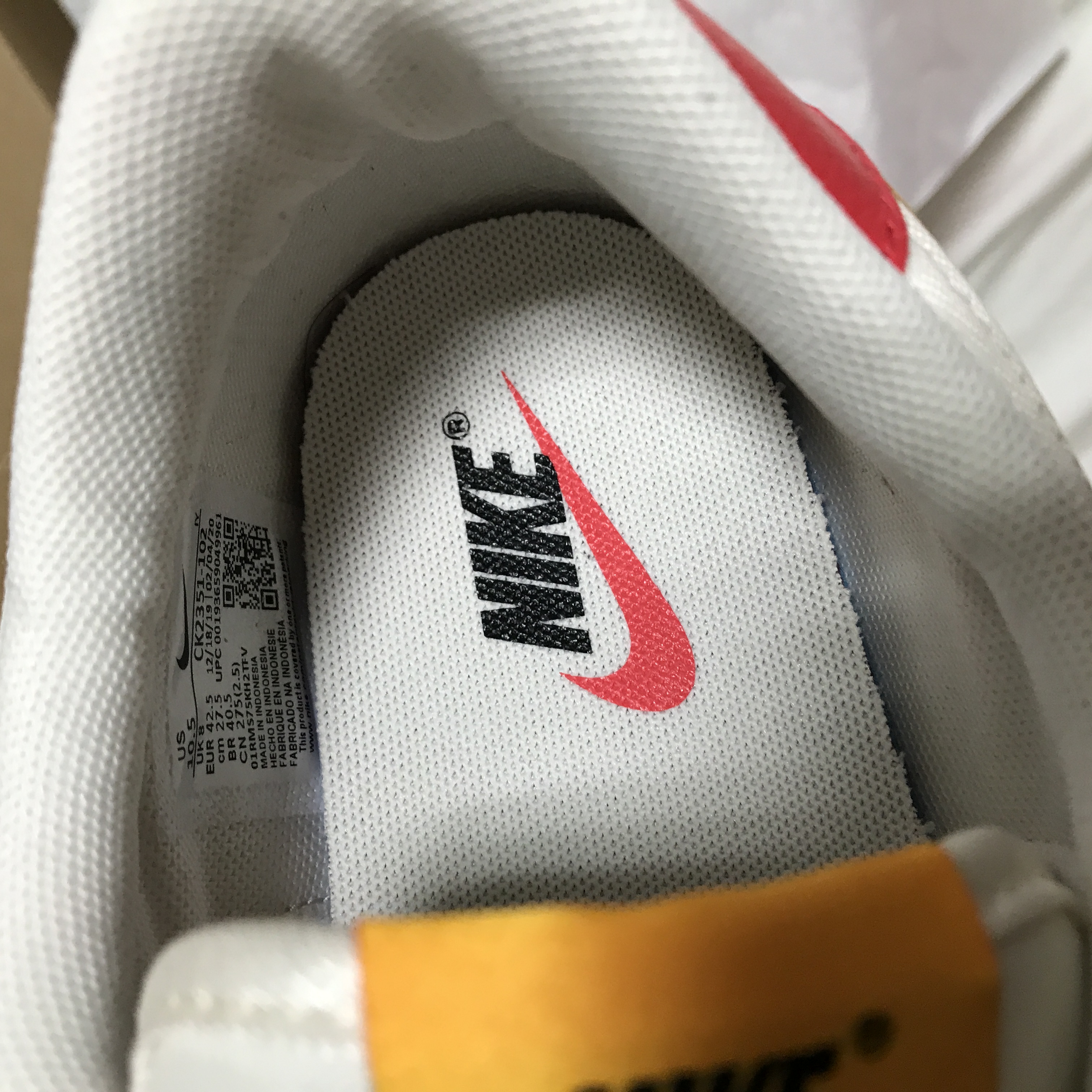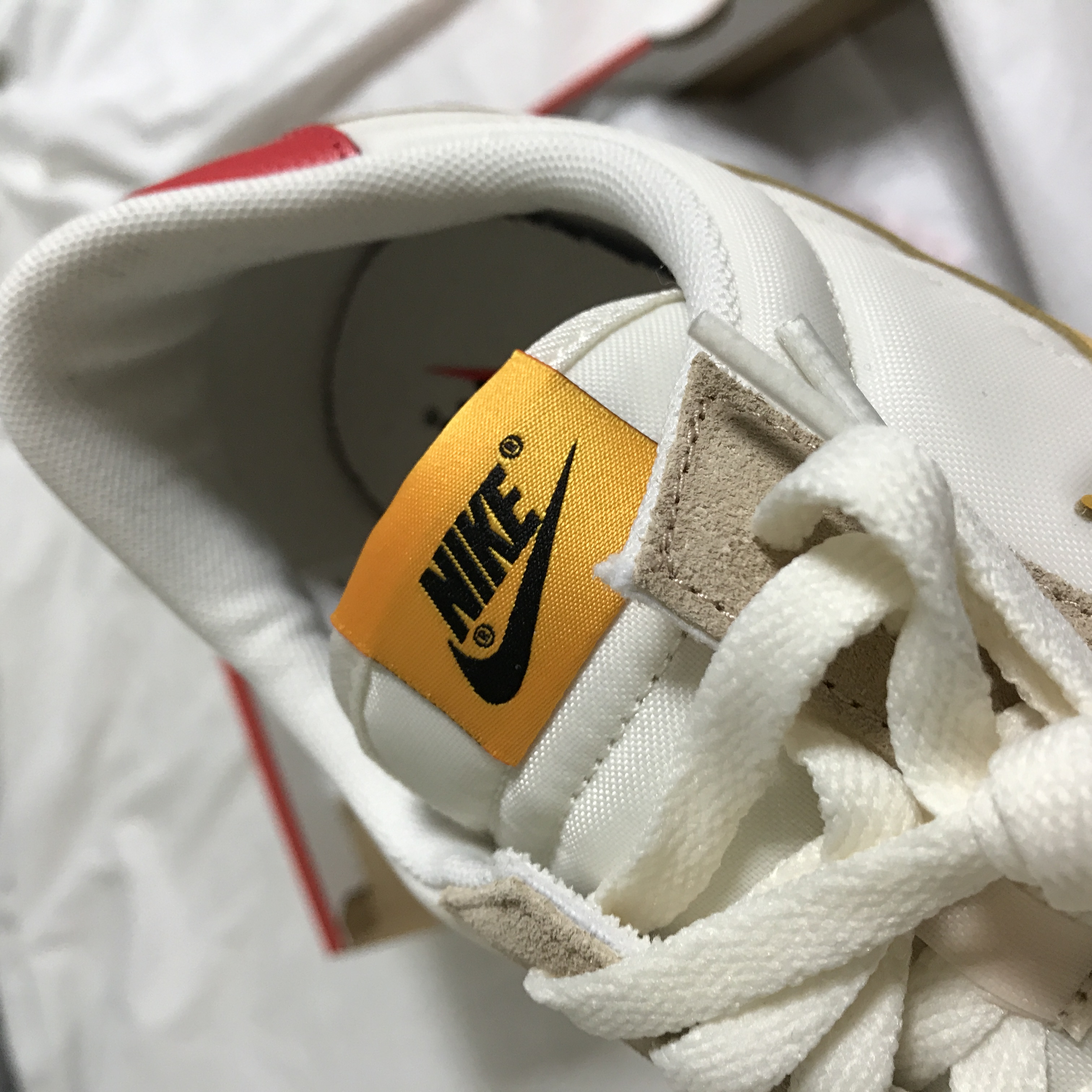 내부 티테일을 보면 여기는 나이키의 스우시 컬러가 레드로 되어 있네요. 그리고 사이즈와 원산지, 제품 코드가 적혀있는 택이 측면에 부착되어 있습니다.