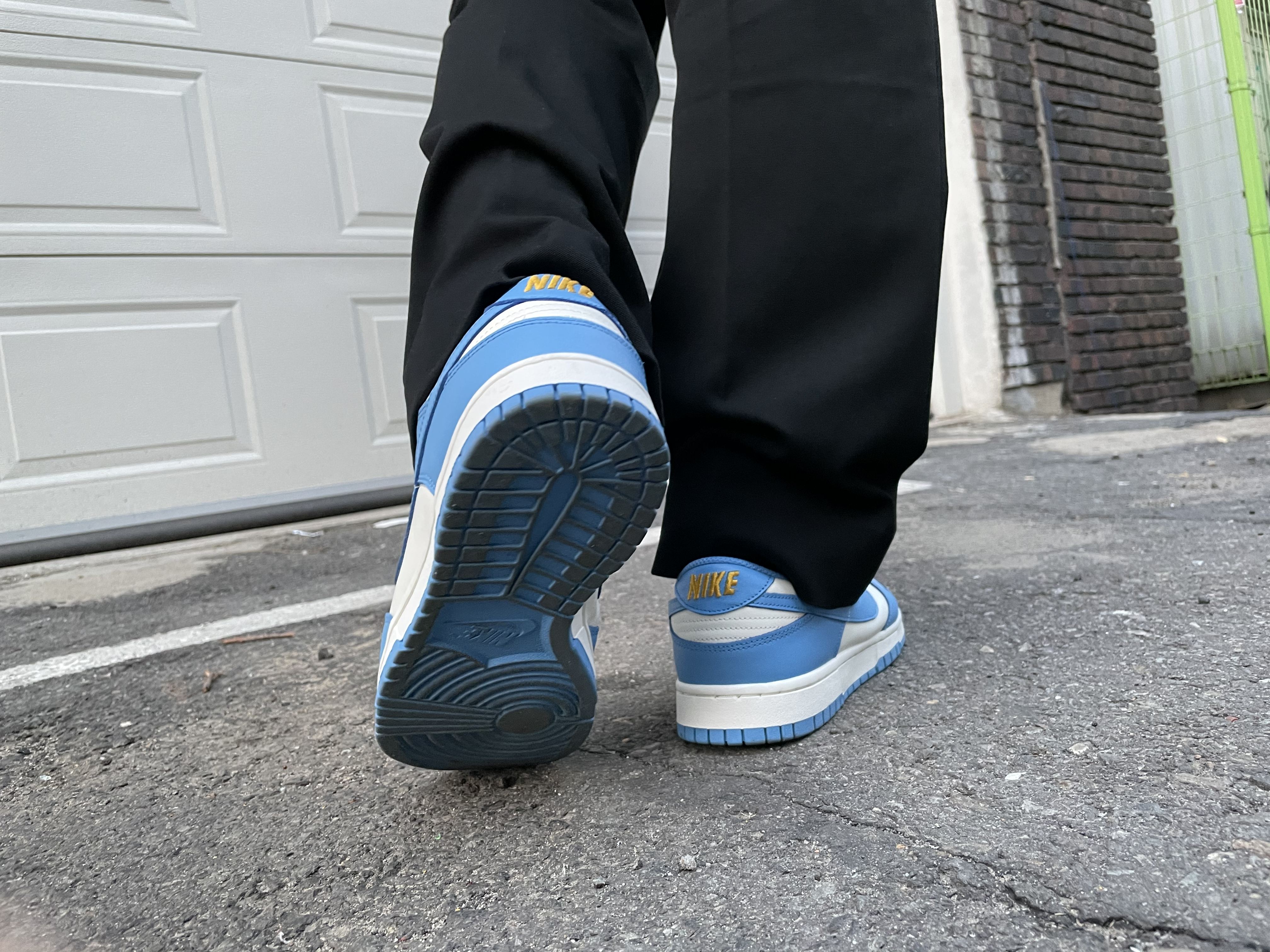 뒤꿈치의 나이키 로고도 골드 컬러로 포인트를 줬네요. 저는 사이즈 275에 당첨되었는데요, 평소 270과 275를 왔다 갔다 하는 제 발에는 275 사이즈의 덩크가 딱 적당한 착용감이었어요.