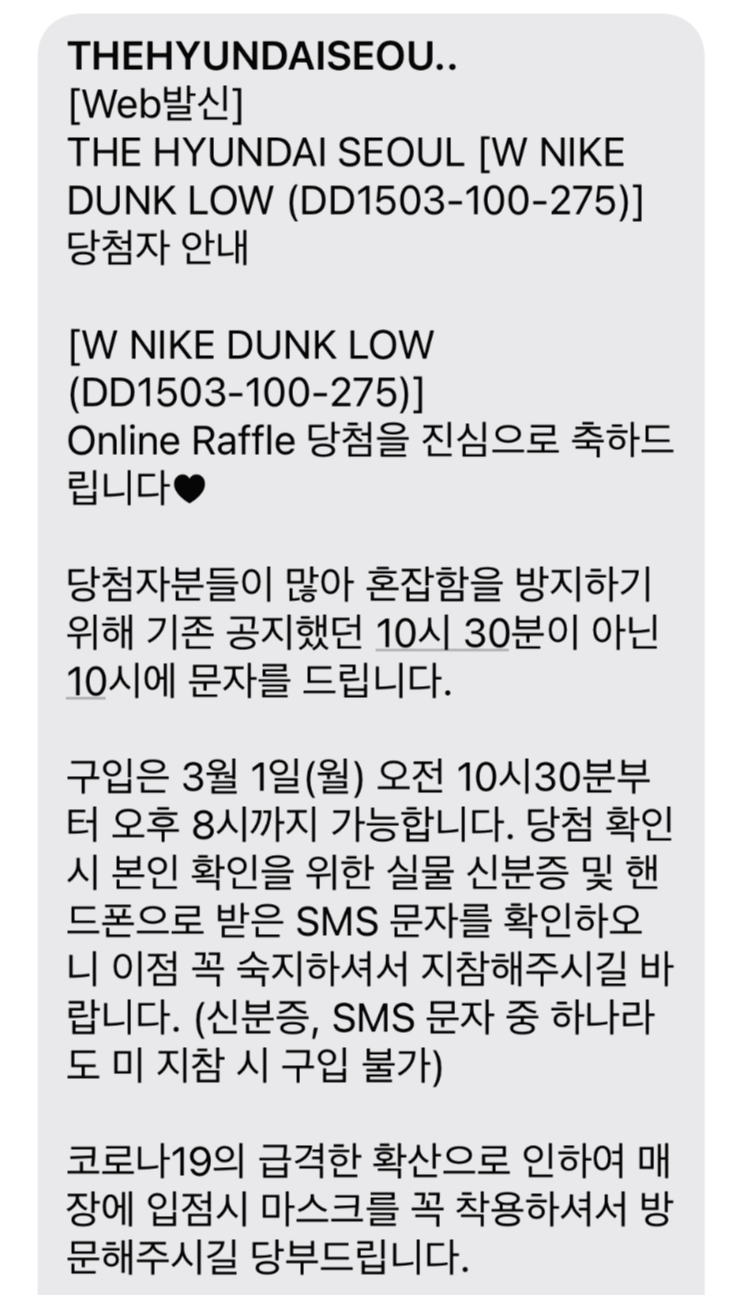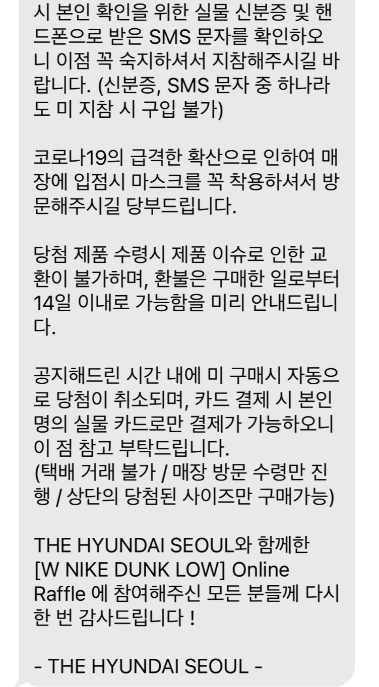 매번 나이키로부터 '항상 나이키를 사랑해주셔서 감사합니다'라는 문자만 받다가 더현대 서울에서 진행한 깜짝 드로우에서 오랜만에 당첨 문자를 받으니 너무 기분이 좋더라고요. 특히 나이키 덩크 제품은 한 족도 없었던 터라 더 셀레는 마음으로 구매를 진행했습니다.