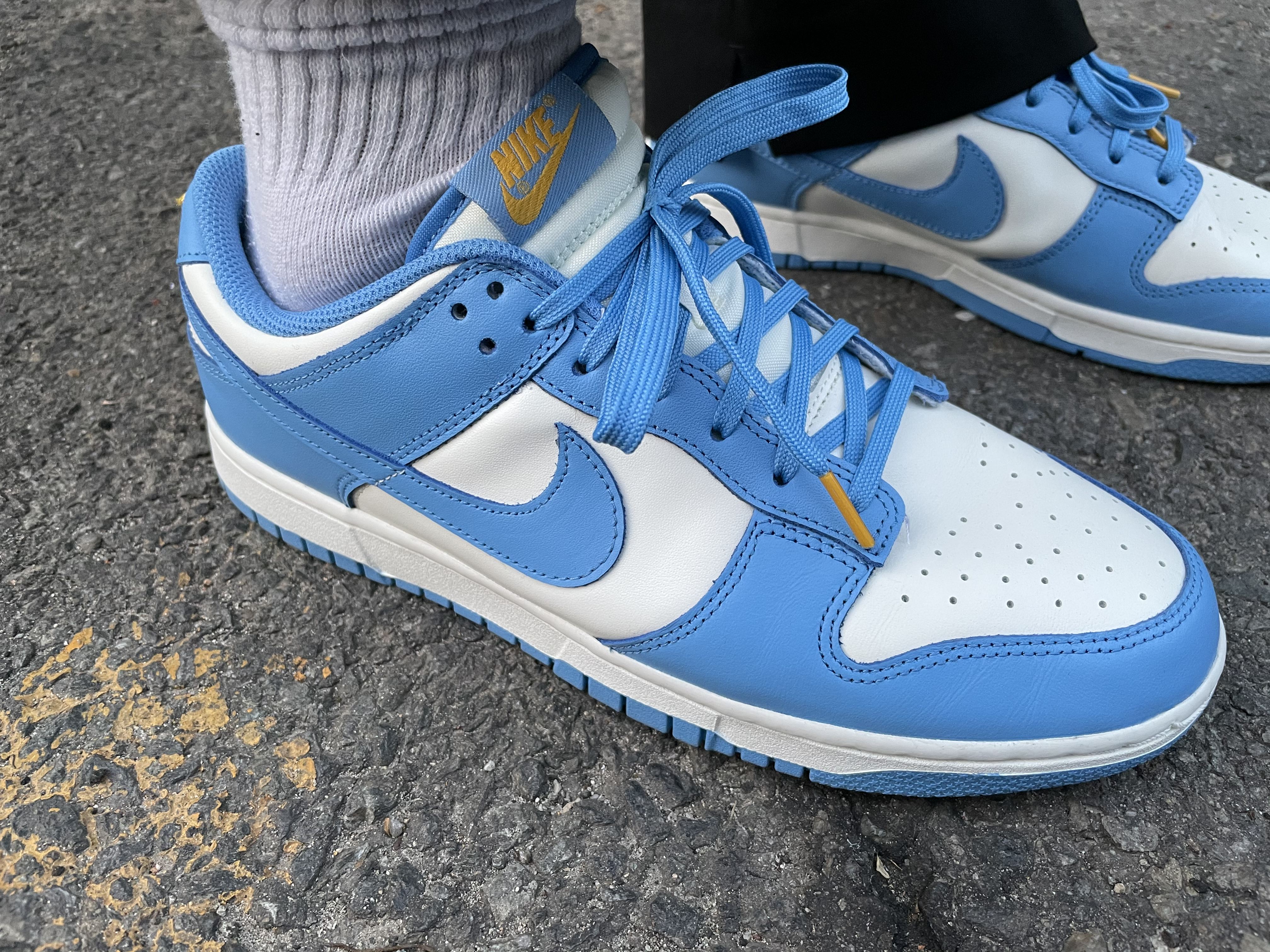 나이키 덩크 로우 코스트 제품은 총 세 가지 컬러가 섞여있는데요, 가장 눈에 띄는 COAST와 SAIL 컬러, 나이키 스우시와 슈레이스 끝부분은 UNIVERSITY GOLD라는 컬러로 포인트 되어 있어요. 저는 특히 이 골드 컬러로 포인트를 준 게 가장 마음에 들었어요.