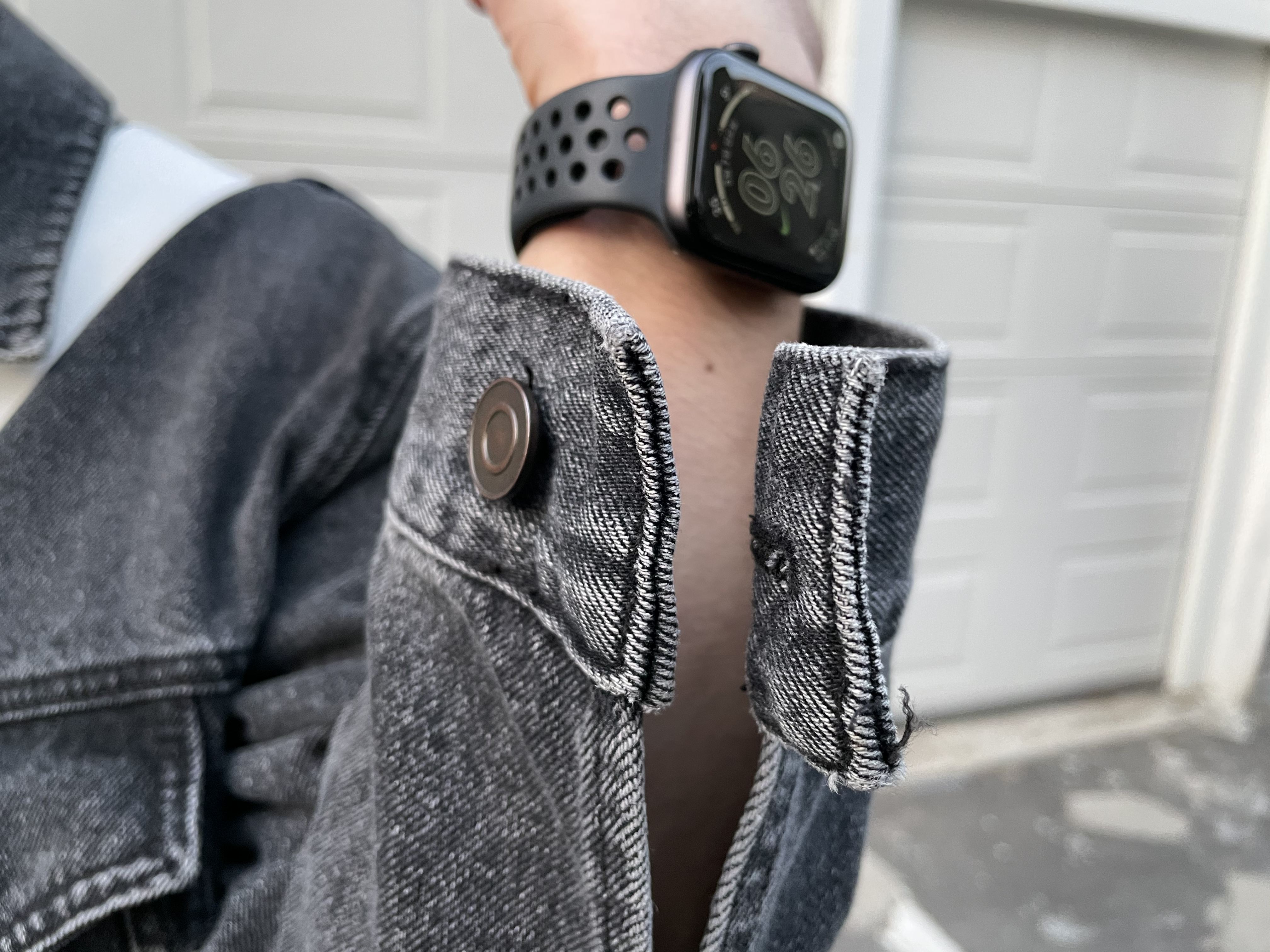 디테일을 살펴보면 소매가 절개되어 있어서 손을 씻을 때나 음식을 먹을 때 접어 올려서 입을 수도 있습니다. 저는 개인적으로 소매 부분의 단추 잠그는 것을 좋아하지 않아서 항상 이렇게 풀고 다녀요.