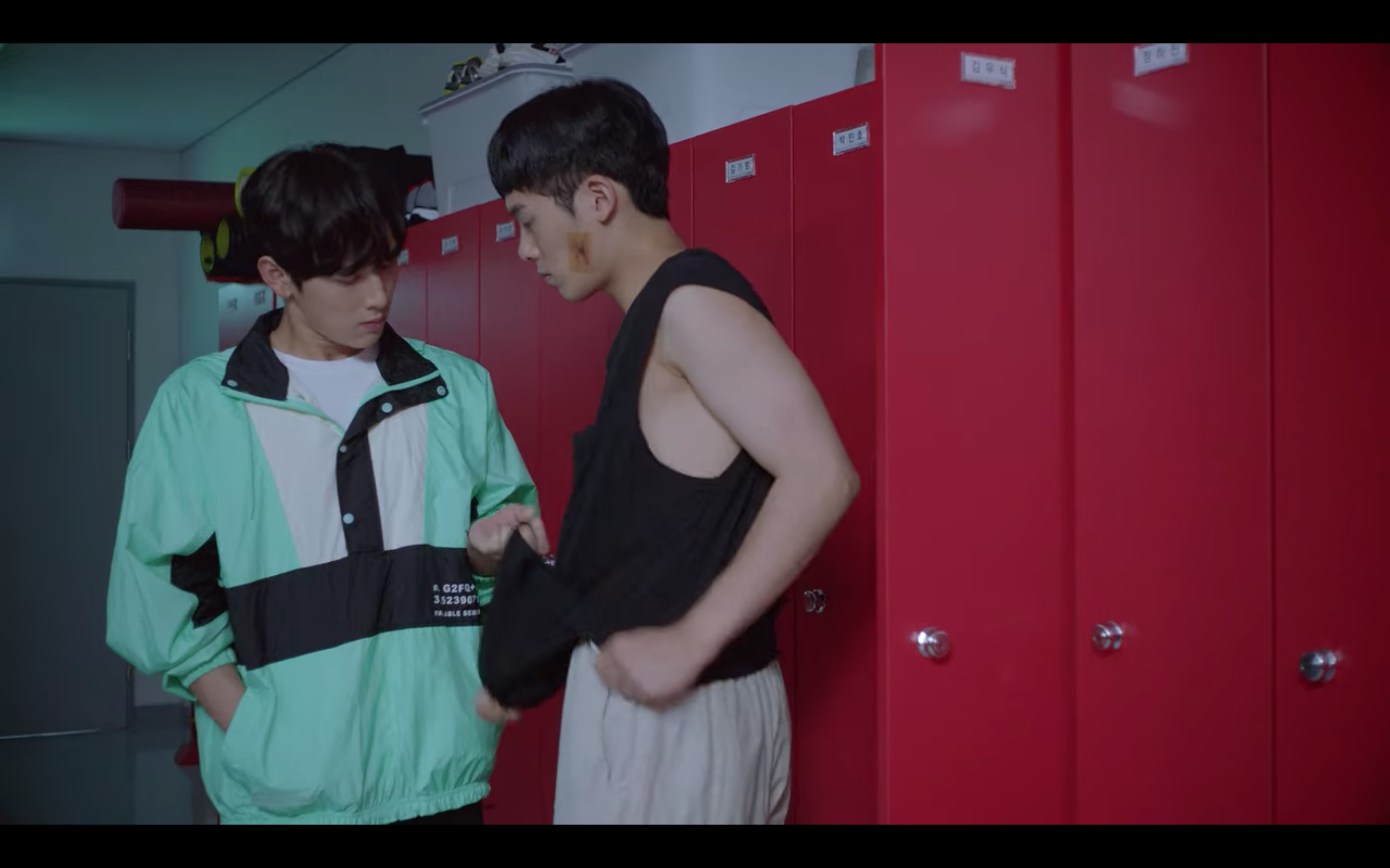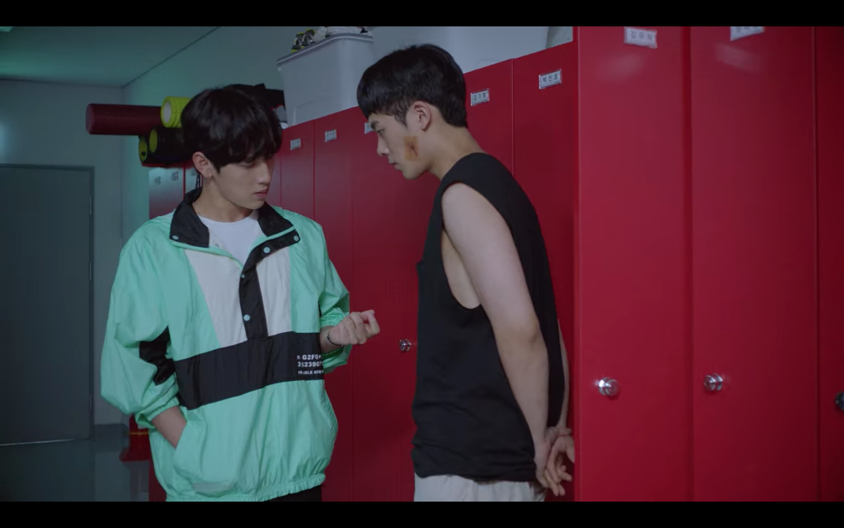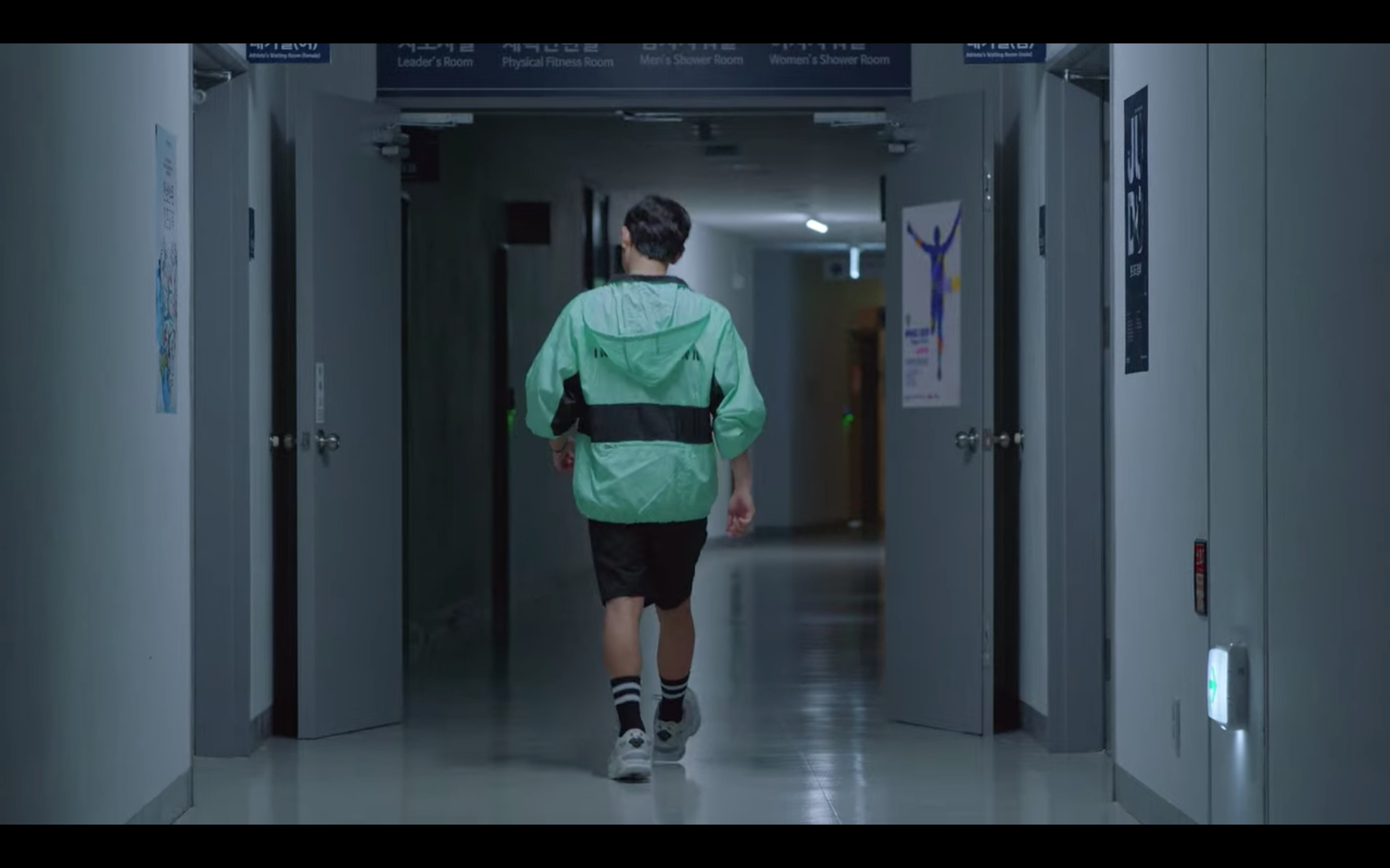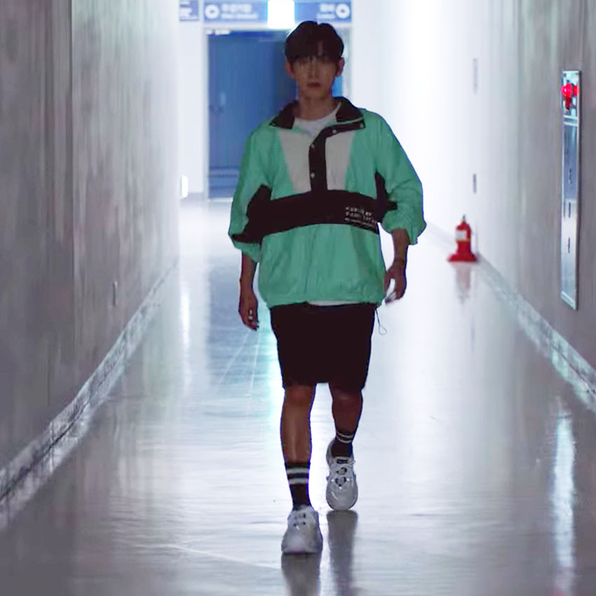 해당 장면은 육상계 간판스타인 기선겸이 코치에게 폭행당한 후배를 찾아가는 씬인데요, 민트 컬러의 아노락 자켓과 편안한 핏의 반바지에 앤더슨벨 유니섹스 러너 스니커즈로 운동선수의 캐릭터를 아주 잘 살려주었어요.
