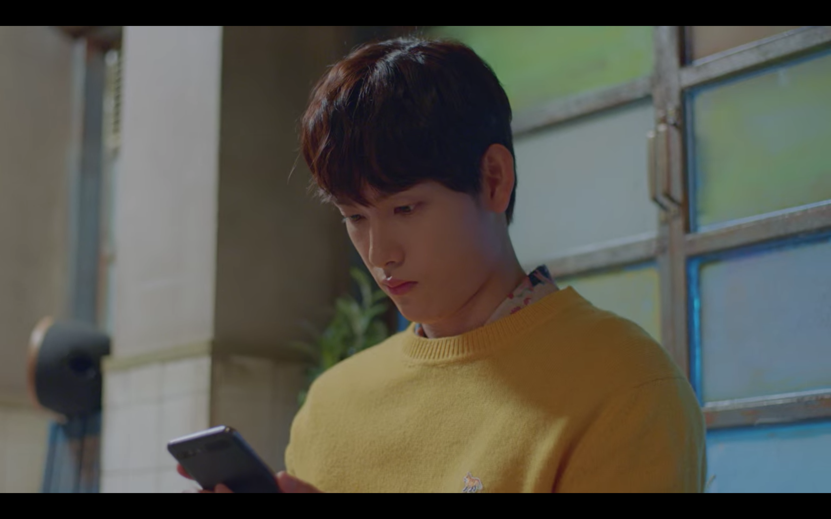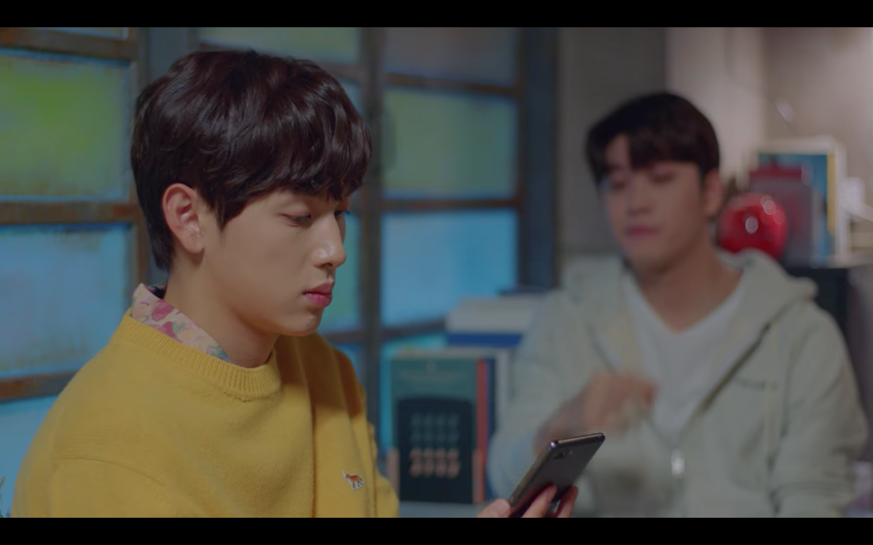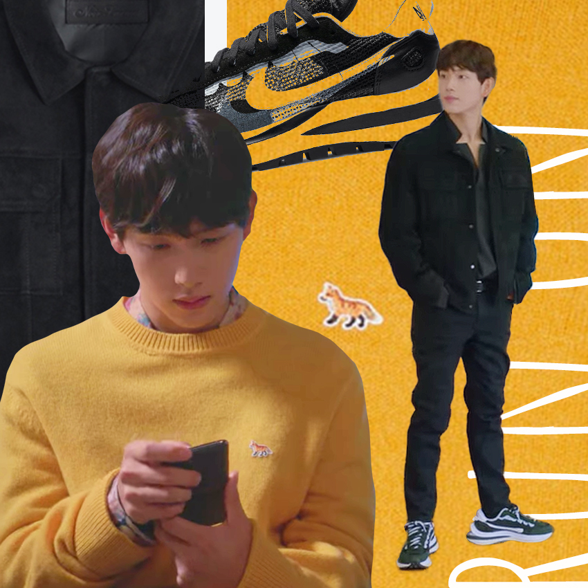첫 번째 제품은 극 중에서 육상계 간판스타인 기선겸 역할을 맡은 배우 임시완 님이 착용한 이 노란색 니트인데요, 이영화 역할을 맡은 배우 강태오 님과 대화하는 장면에서 만나볼 수 있었어요. 노란 컬러의 제품을 소화하기가 쉽지 않았을 텐데 임시완 님은 그레이 계열의 슬랙스와 화려한 플라워 패턴으로 추측되는 셔츠를 이너로 매치하여 조화로운 스타일을 선보여 주셨습니다.