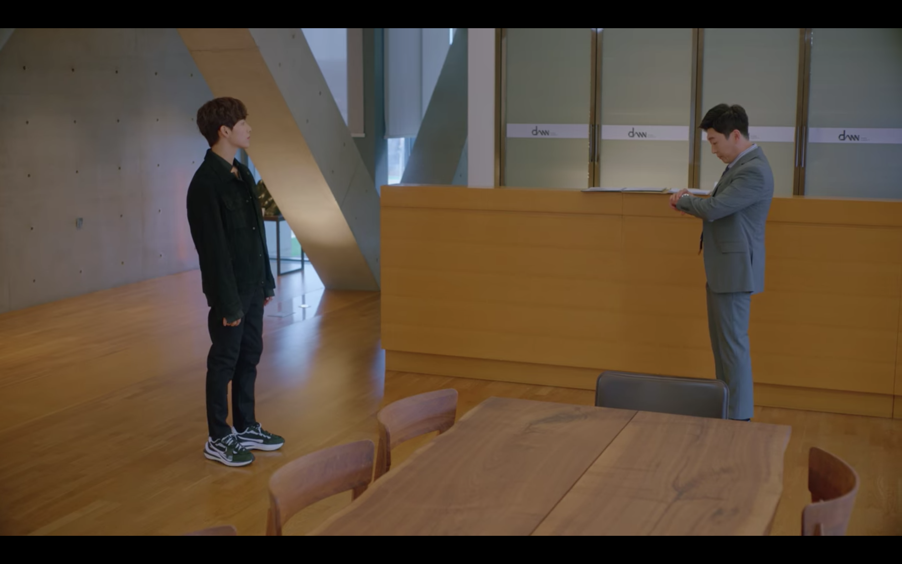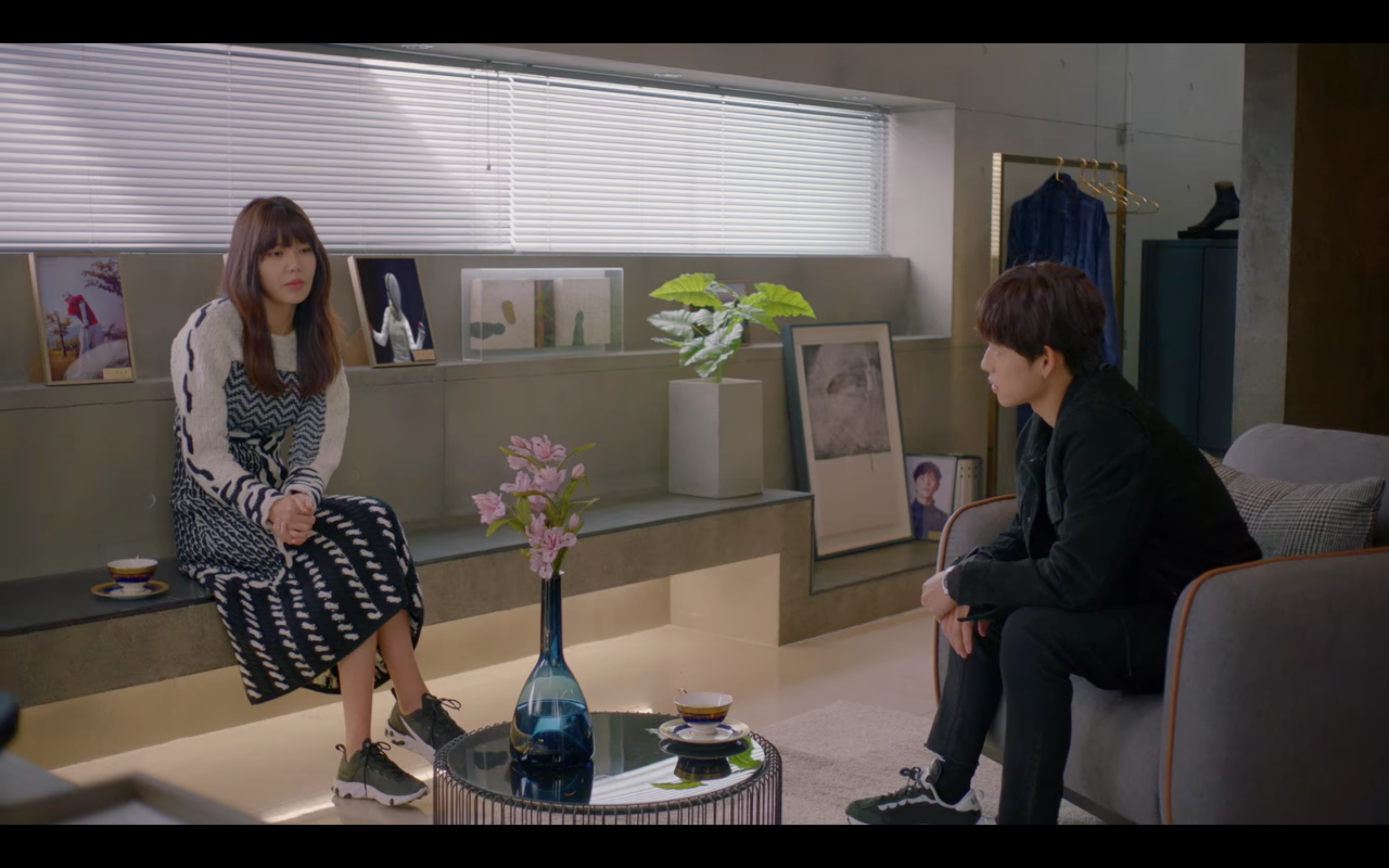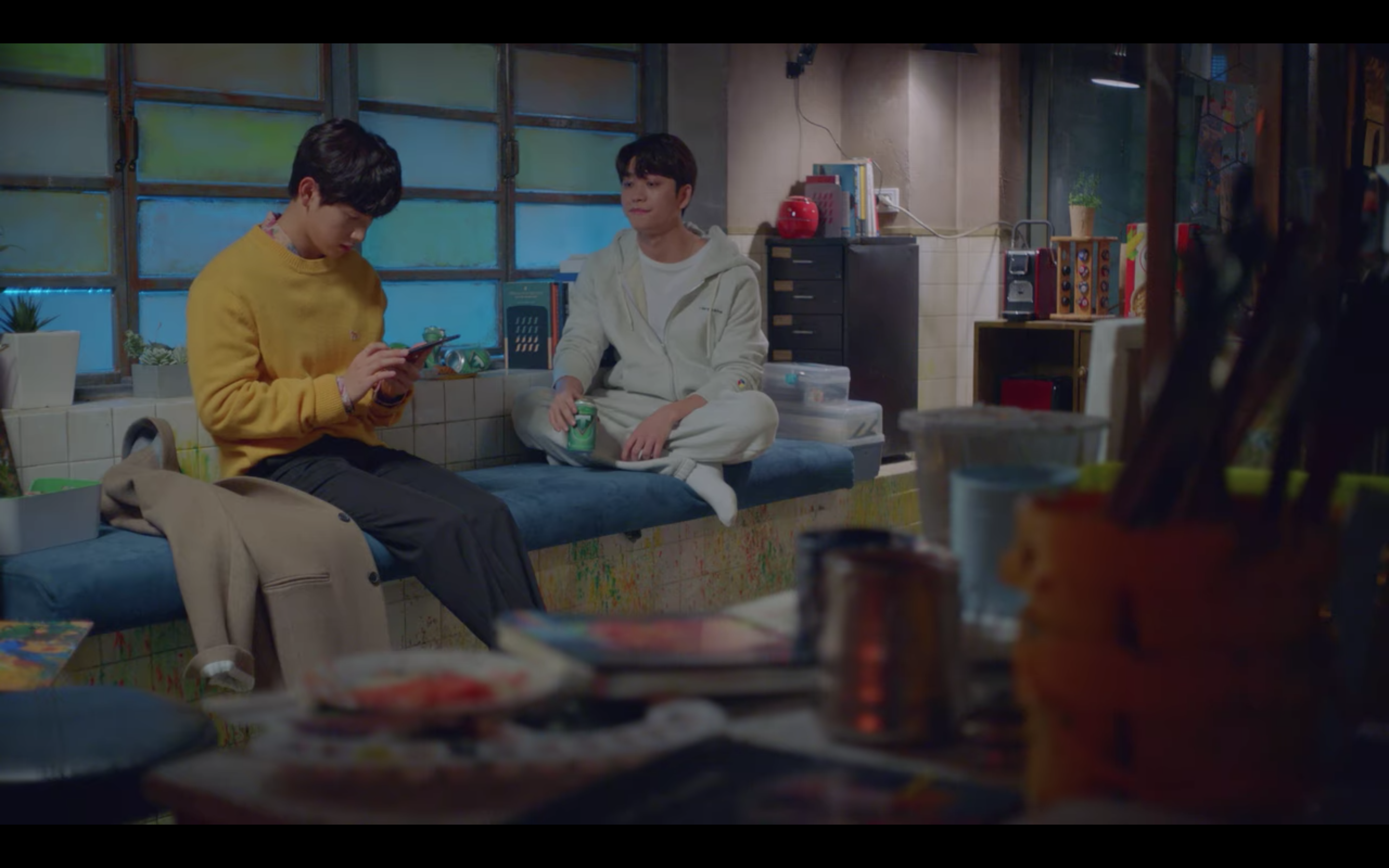 첫 번째 제품은 극 중에서 육상계 간판스타인 기선겸 역할을 맡은 배우 임시완 님이 착용한 이 노란색 니트인데요, 이영화 역할을 맡은 배우 강태오 님과 대화하는 장면에서 만나볼 수 있었어요. 노란 컬러의 제품을 소화하기가 쉽지 않았을 텐데 임시완 님은 그레이 계열의 슬랙스와 화려한 플라워 패턴으로 추측되는 셔츠를 이너로 매치하여 조화로운 스타일을 선보여 주셨습니다.