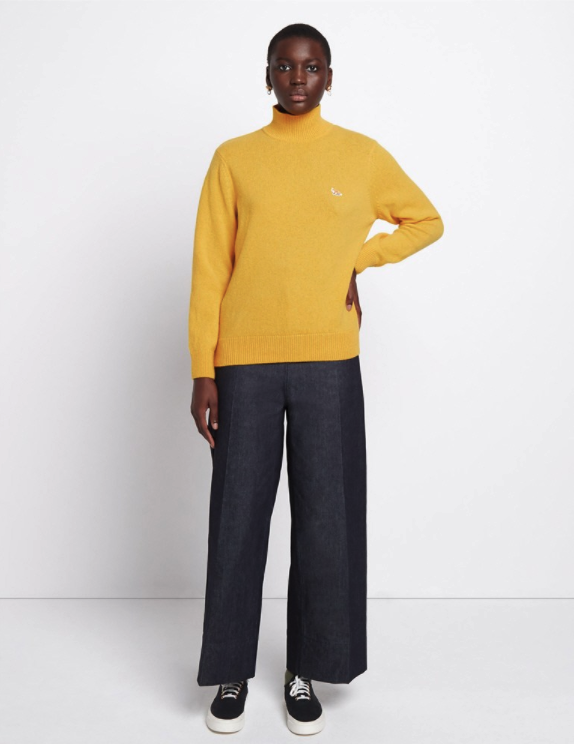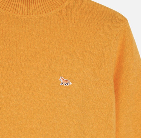 좀 더 클로즈업된 컷에서 이 제품의 브랜드를 확인할 수 있는데요, 왼쪽 가슴팍의 조그마한 여우 로고를 보고 메종키츠네라는 걸 알 수 있었어요. 가까이서 보니 노란 색감이 그렇게 튀지 않고 차분한 느낌이 드는 것 같습니다. 그리고 두께감도 그렇게 두껍지 않아 보여요.