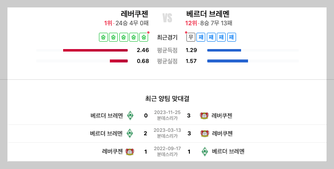 분데스리가 조기 우승을 확정지은 홈팀 레버쿠젠의 선발 라인업은 위와 같은데요. 사비 알론소 감독은 3-4-2-1 포메이션을 가동했으며, 상대인 베르더 브레멘의 경기력을 앞도하며 무려 5골을 몰아 넣었습니다.