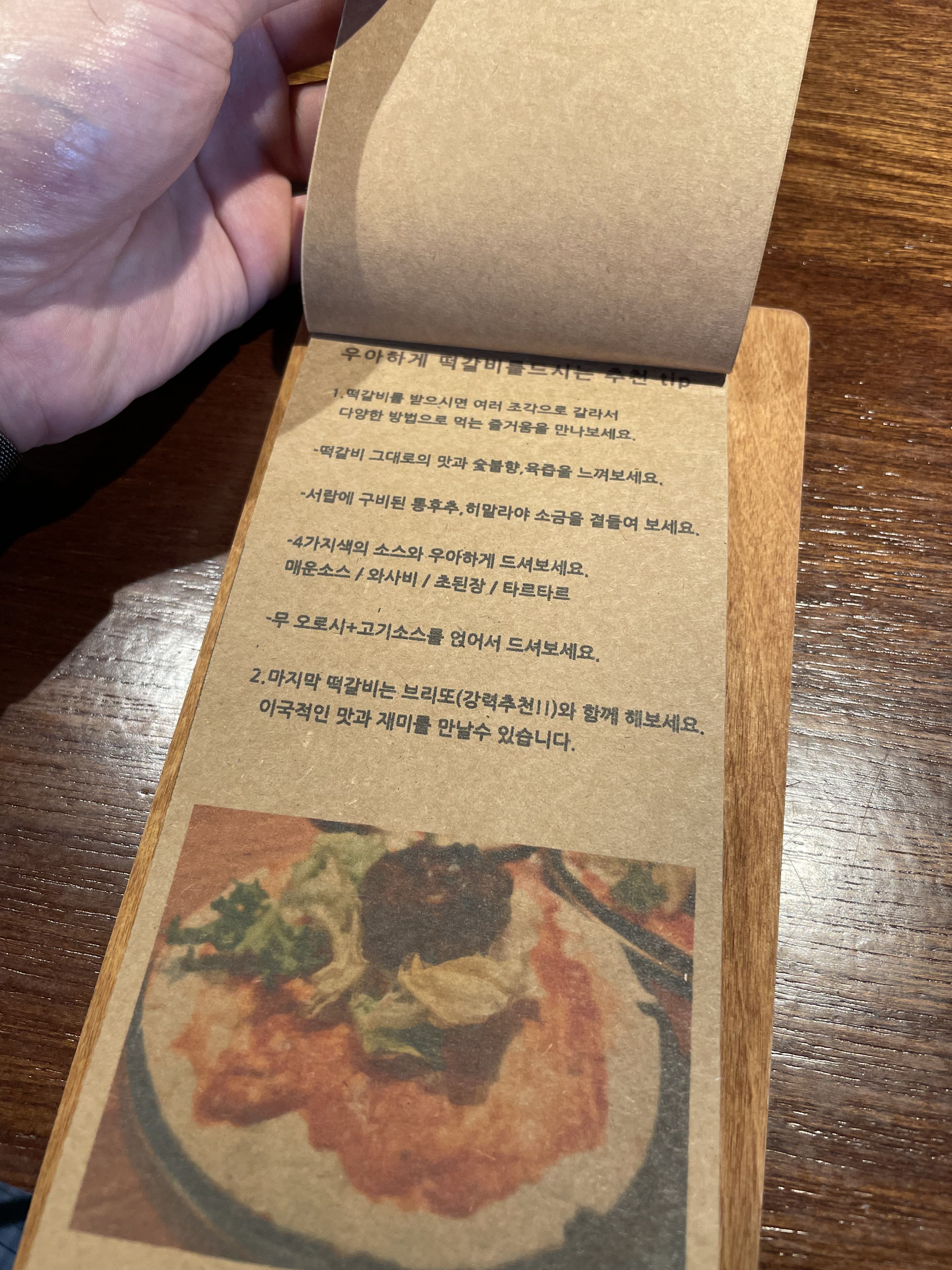저처럼 우아하게를 처음 방문하는 사람을 위해 메뉴판에 떡갈비를 우아하게 즐길 수 있는 법이 친절하게 적혀 있어요.