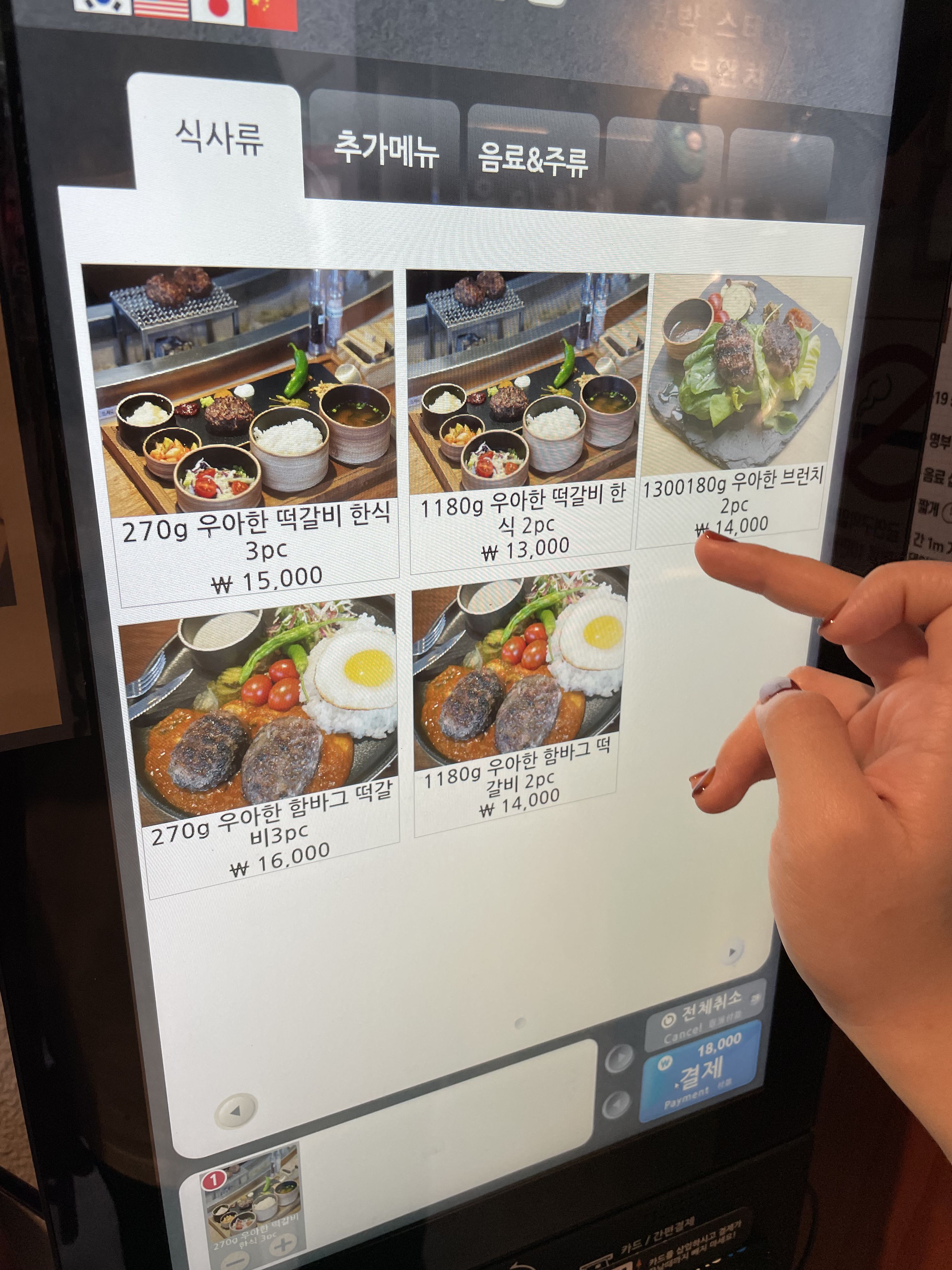 대충 자리를 잡았다면 식당 입구에 있는 키오스크로 메뉴를 주문하면 되는데요, 저와 여자친구 모두 우아하게의 대표 메뉴인 우아한 떡갈비 한식 3pc를 선택했어요.