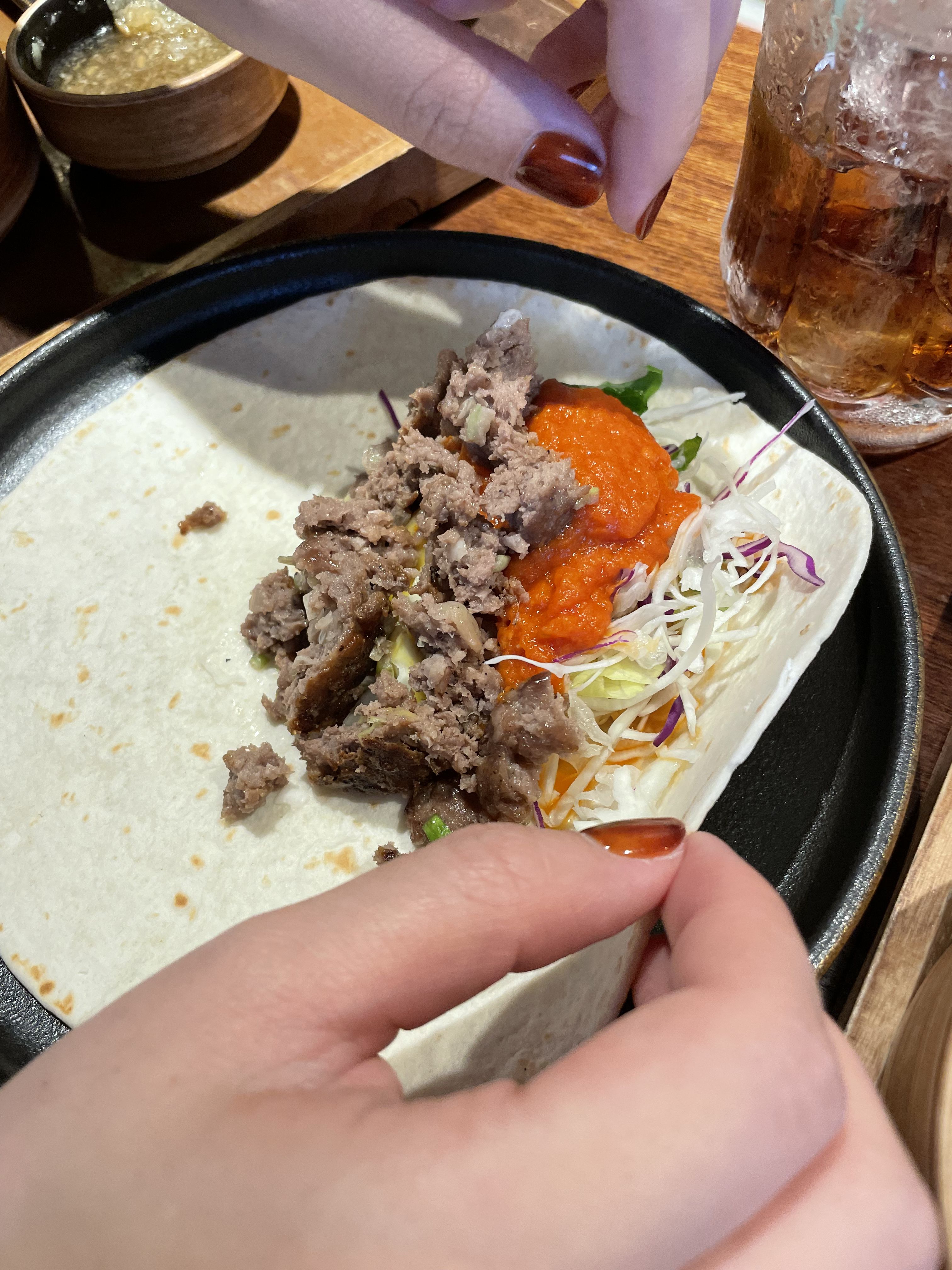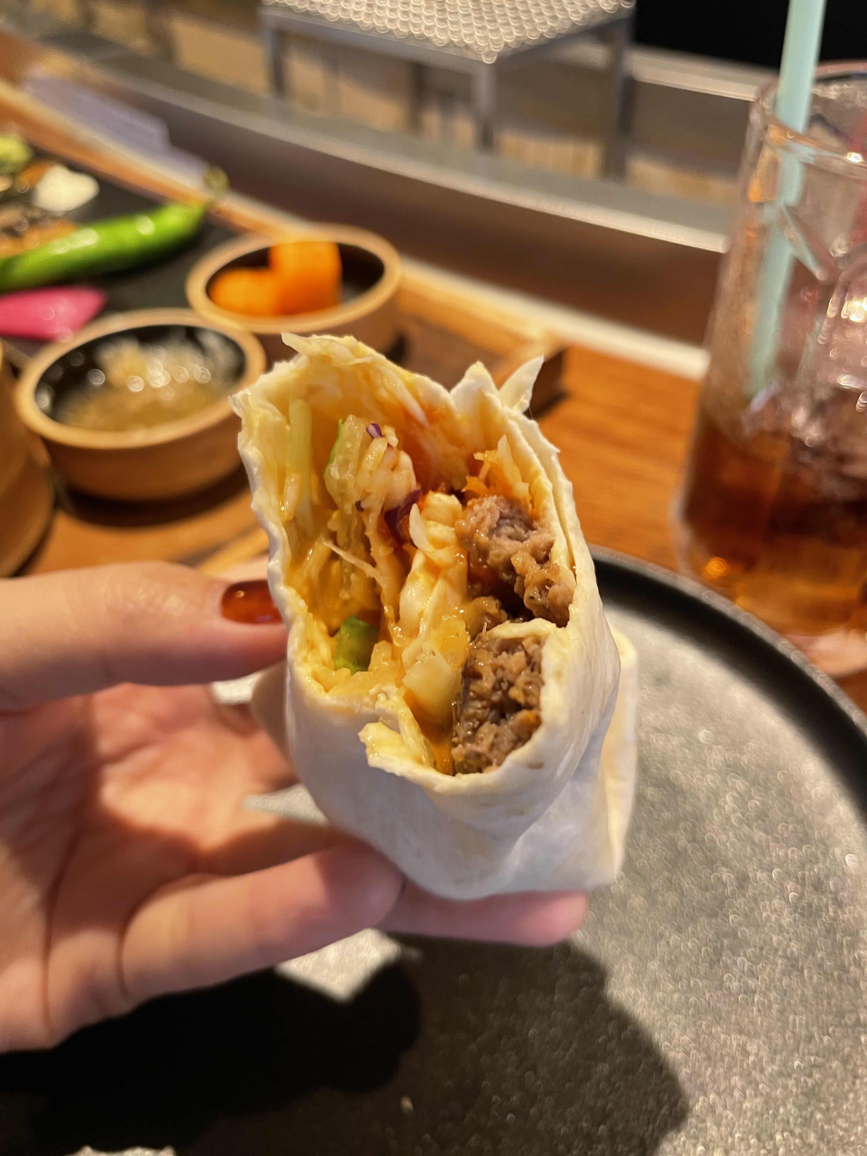 브리또를 이런 식으로 직접 만들어서 먹는 건 처음이었는데 상당히 맛있더라고요. 야채와 소스가 뜨거운 떡갈비랑 조화가 좋았습니다.