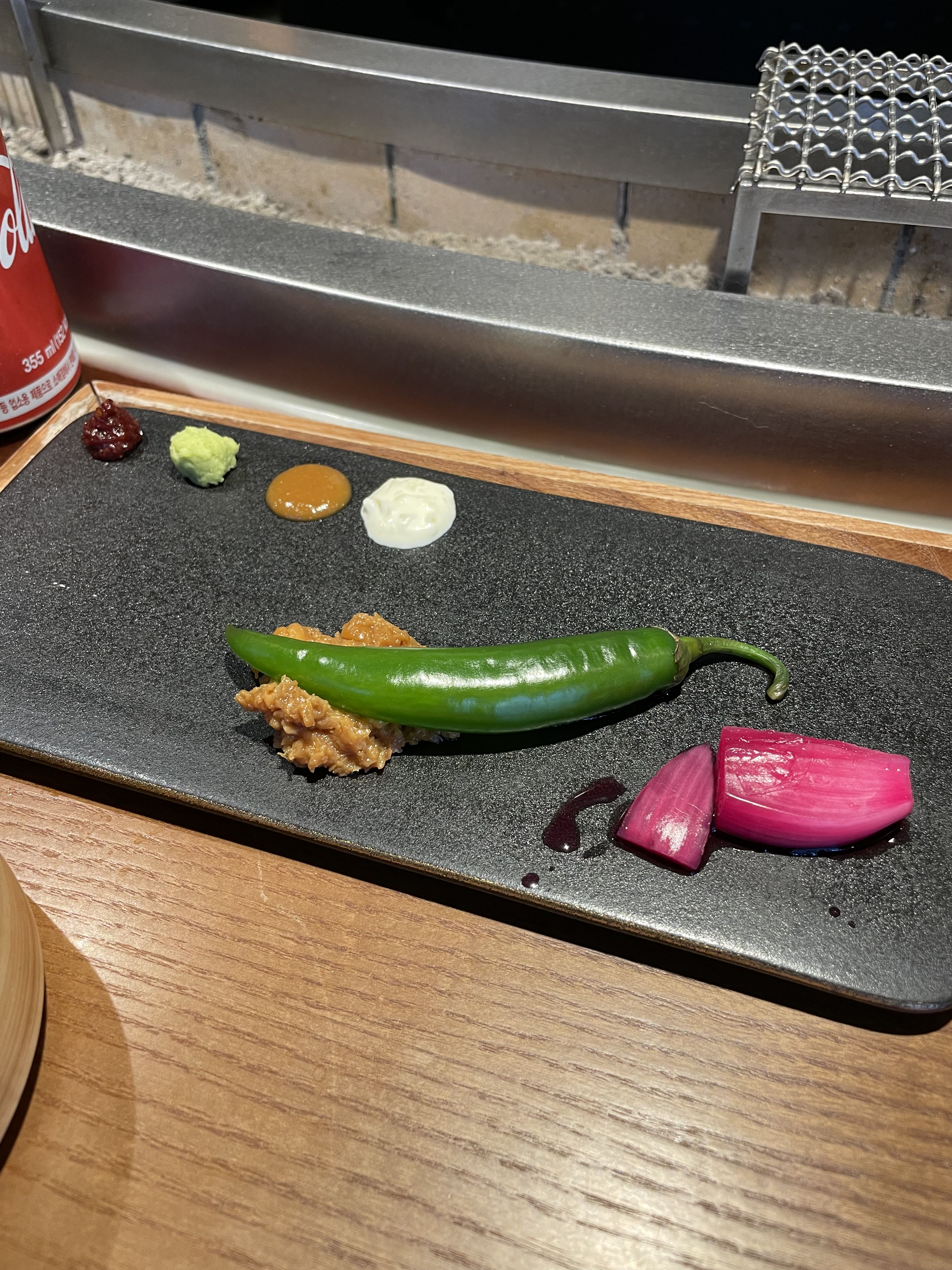 기다리는 동안 기본 반찬 및 소스가 세팅된 쟁반이 나왔어요. 소스는 왼쪽부터 매운 소스와 와사비, 초된장, 타르타르로 구성되어 있고요, 오른쪽에는 무 오로시도 준비되어 있어요.