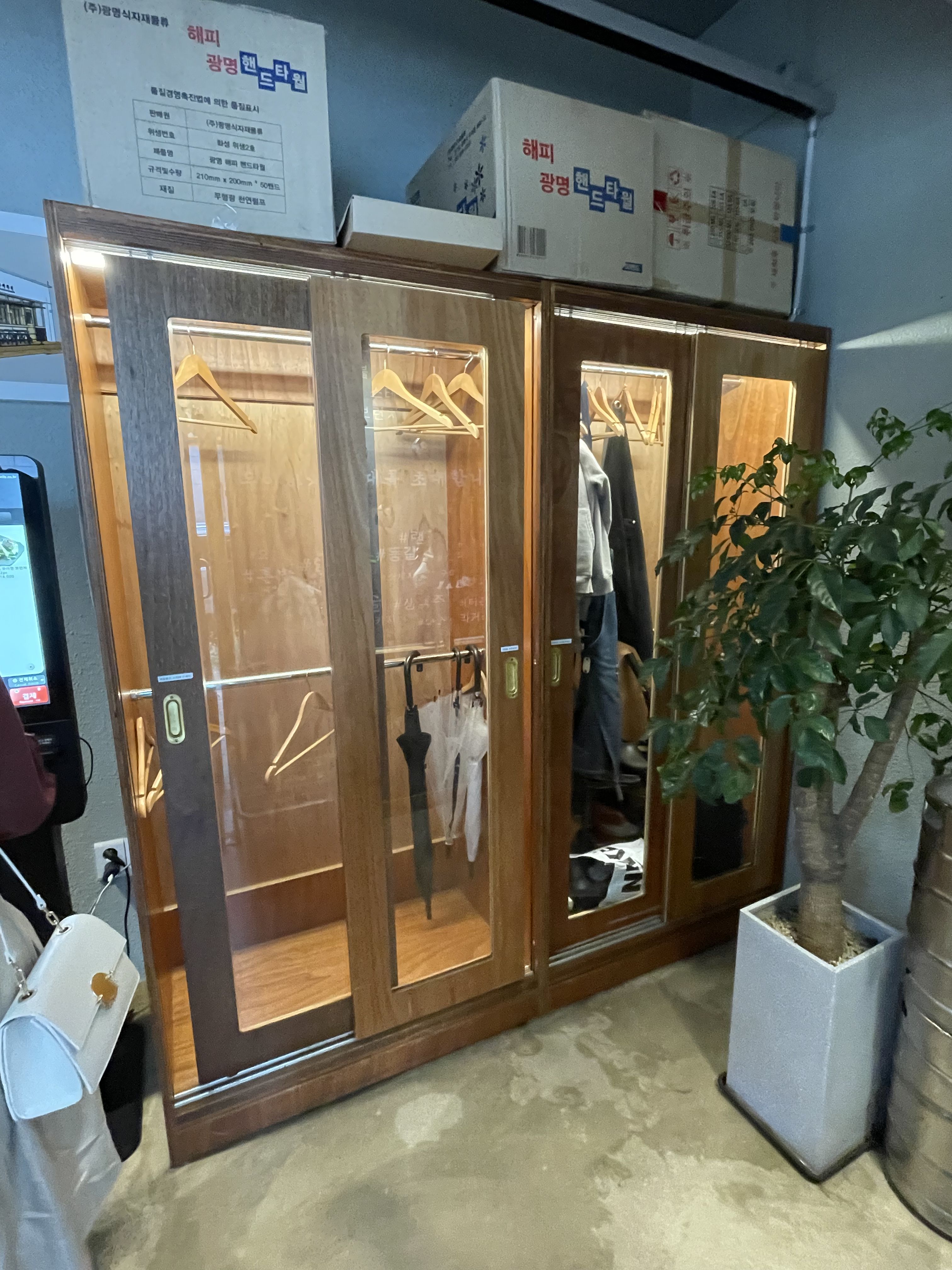 웨이팅 후 식당으로 입장했는데요, 바로 앞에 개인 물품을 보관할 수 있는 옷장이 보였어요. 마치 비스포크 테일러샵에 온 듯한 분위기의 장이었어요.