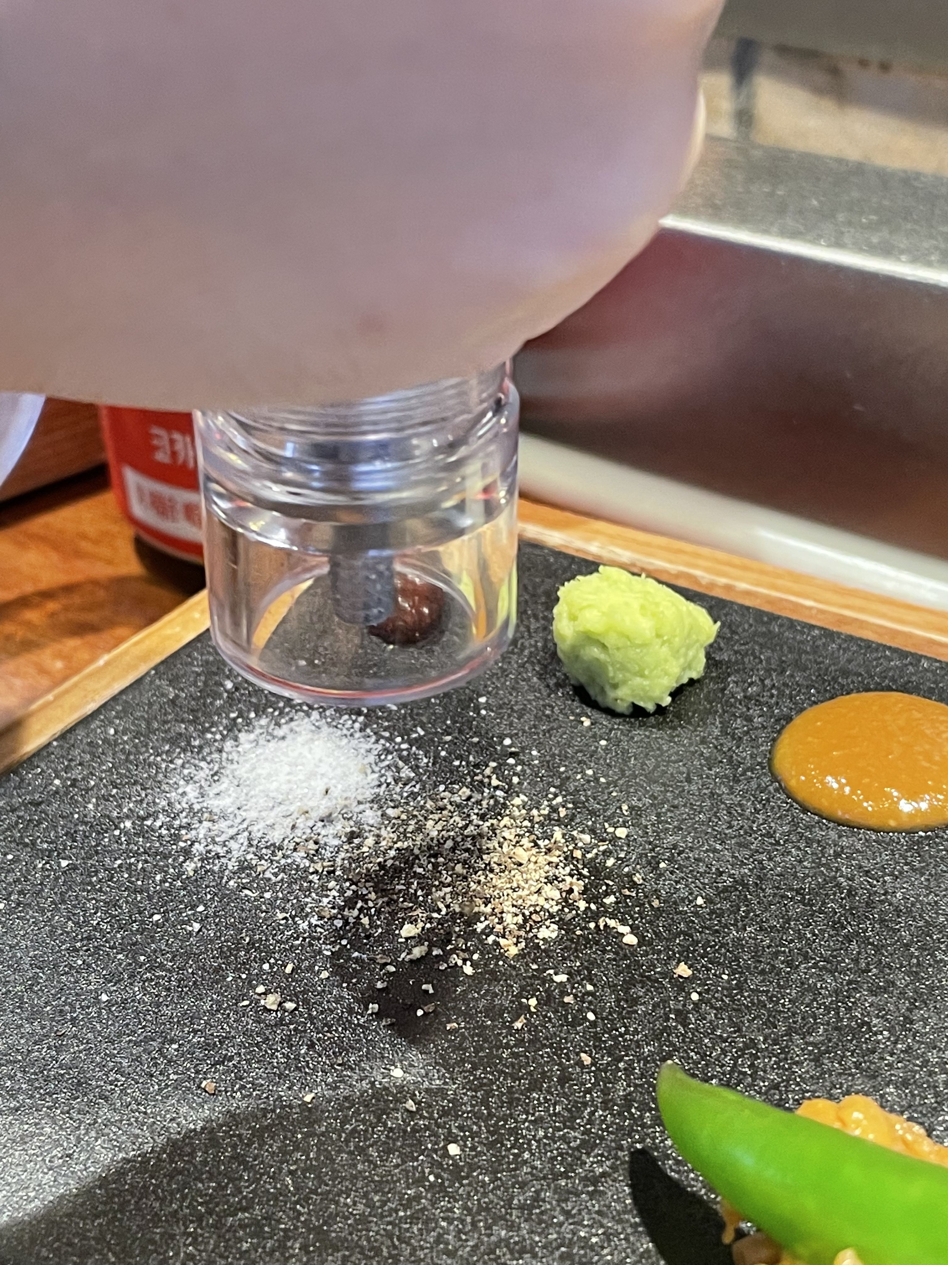 그리고 테이블 밑에 구비되어 있는 히말라야 소금과 통후추를 갈아서 뿌려 먹을 수도 있어요. 개인적으로 히말라야 소금보다는 통후추에 찍어 먹는 게 더 맛나더라고요.
