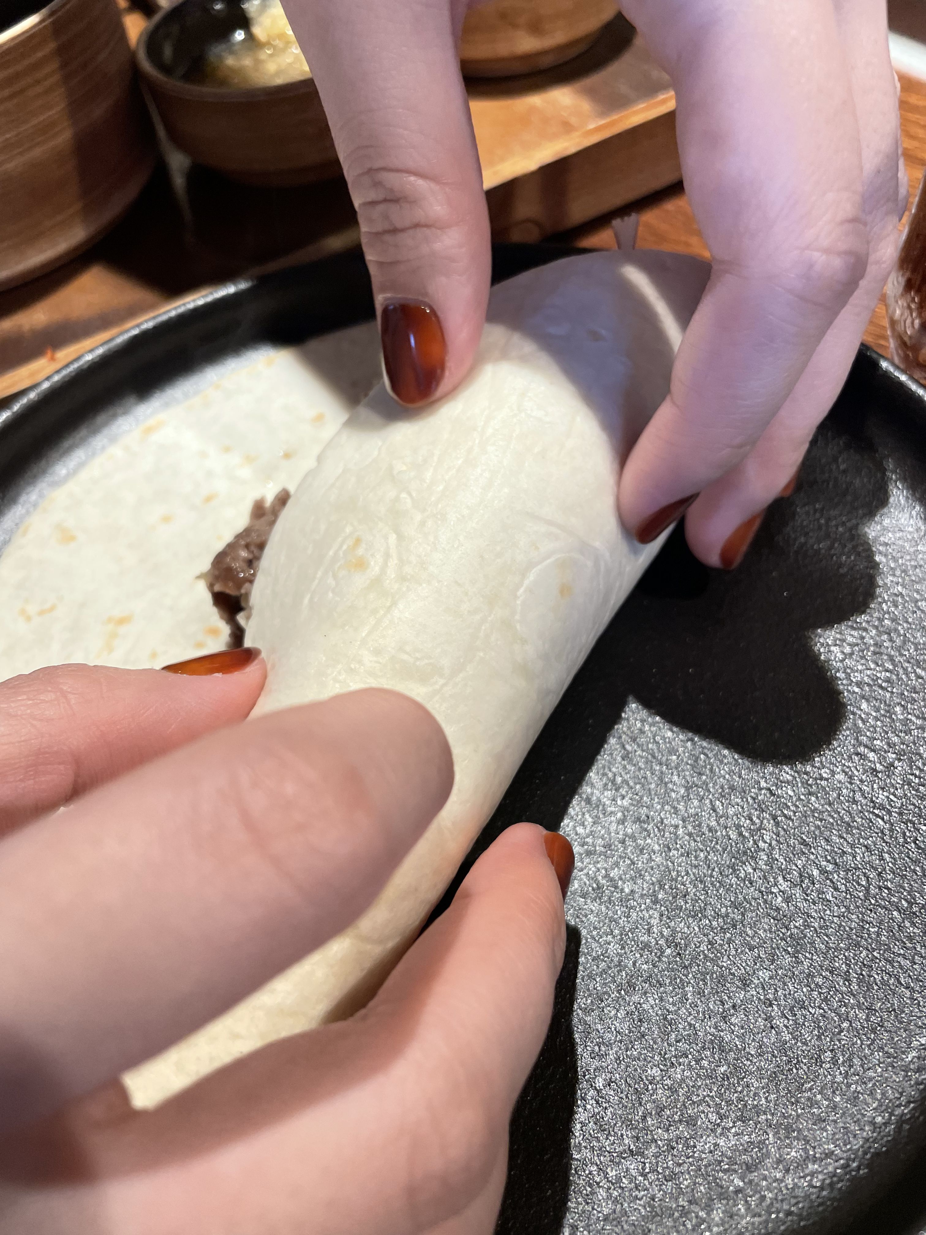 첫 번째 떡갈비를 다 먹고 두 번째로 나온 떡갈비로 브리또를 만들어서 먹었는데요, 떡갈비를 갈기갈기 찢어서 브리또 안에 넣고, 돌돌 말아서 먹으면 돼요.