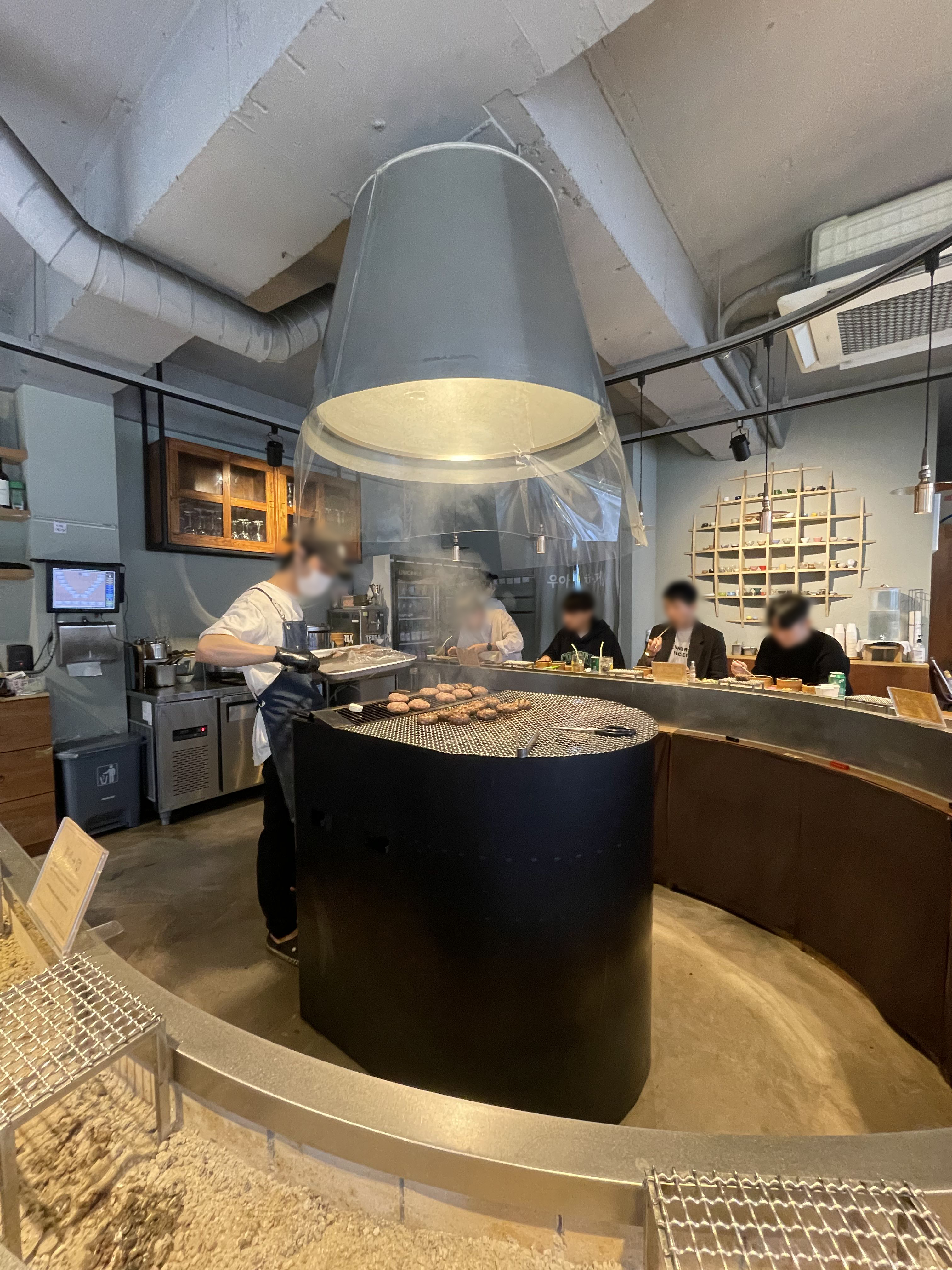 자리 배치는 고기를 굽는 화로를 둘러싼 U자형 테이블과 창가 테이블 두 개로 나뉘어 있어요. 고기를 숯불에 직접 굽는 장면을 보고 싶기도 했고, 따뜻한 떡갈비를 조금이라도 빨리 먹고 싶어서 U자형 테이블에 앉았습니다.