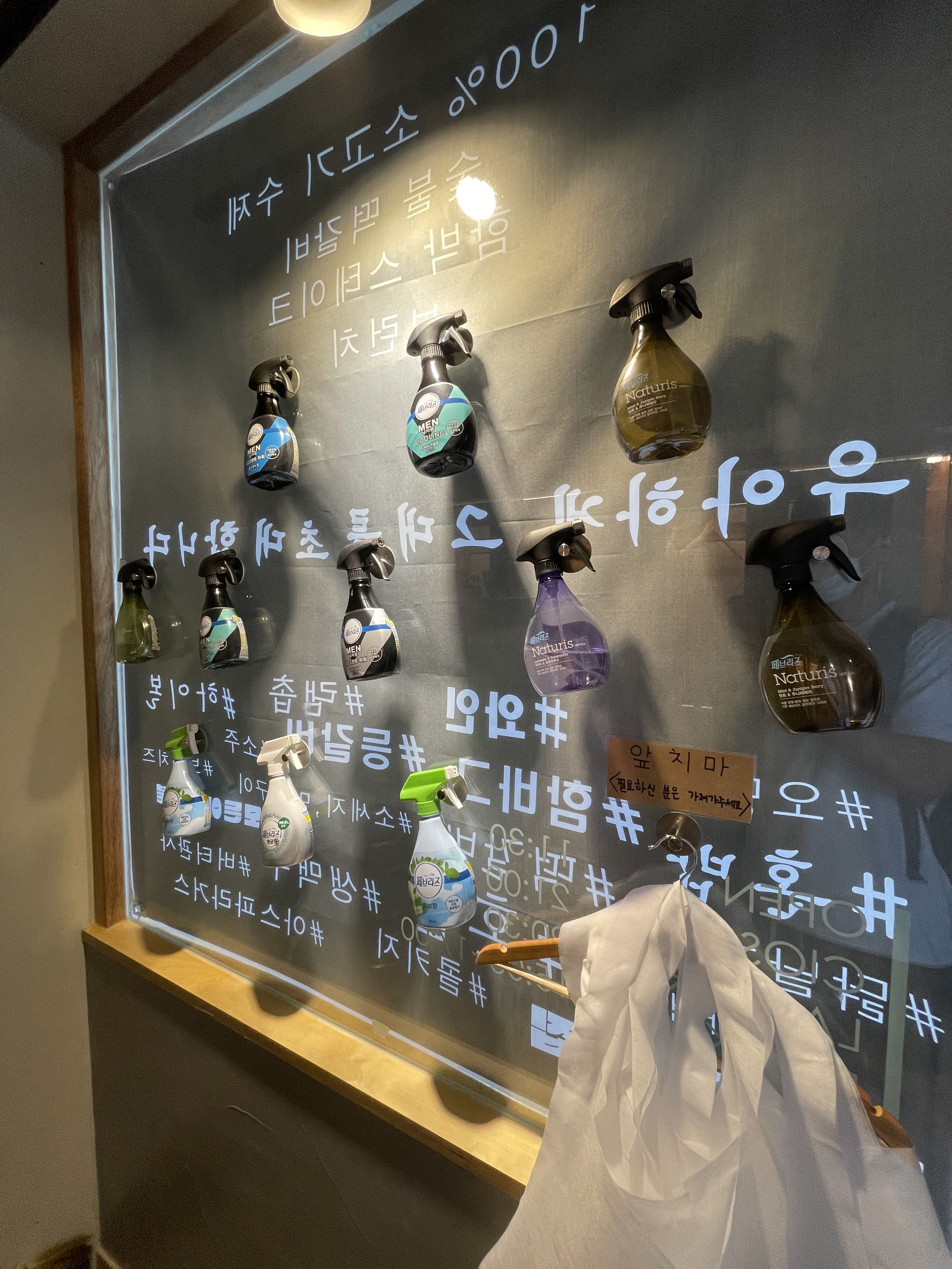 그리고 그 맞은편에는 식사를 다한 뒤 나갈 때 옷에 뿌릴 수 있는 페브리즈가 종류별로 배치되어 있더라고요. 별거 아닐 수 있지만 되게 세심한 배려라고 느꼈어요. 왜냐면 저 같은 경우 집에서 페브리즈를 굉장히 자주 사용하고 있는데 많은 종류 중에서도 선호하는 특정 향이 있거든요. 그 향이 우아하게에도 있더라고요.