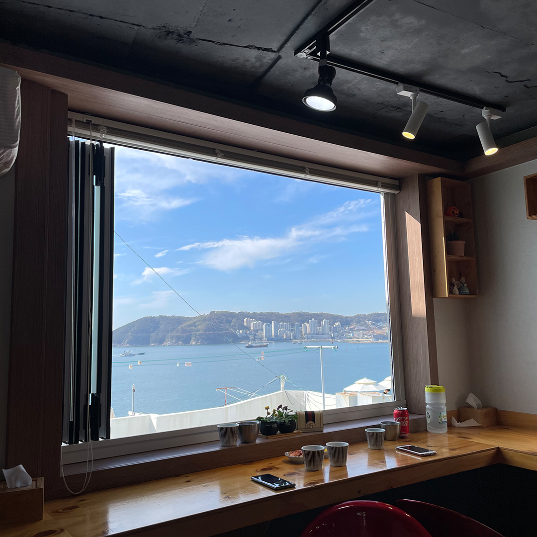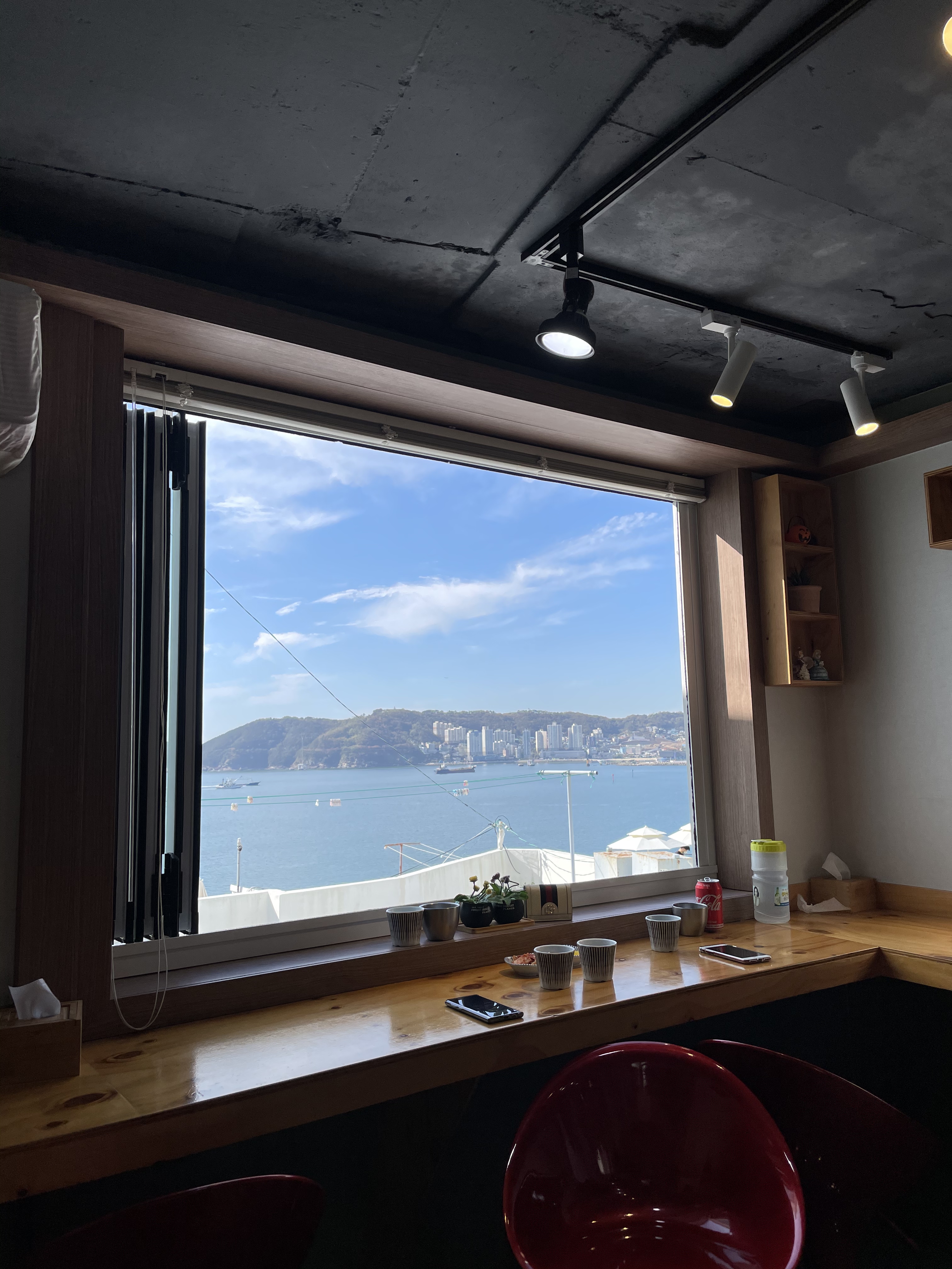 창밖으로 보이는 영도 바다와 하늘을 보니 마음이 정말 평온해졌어요.