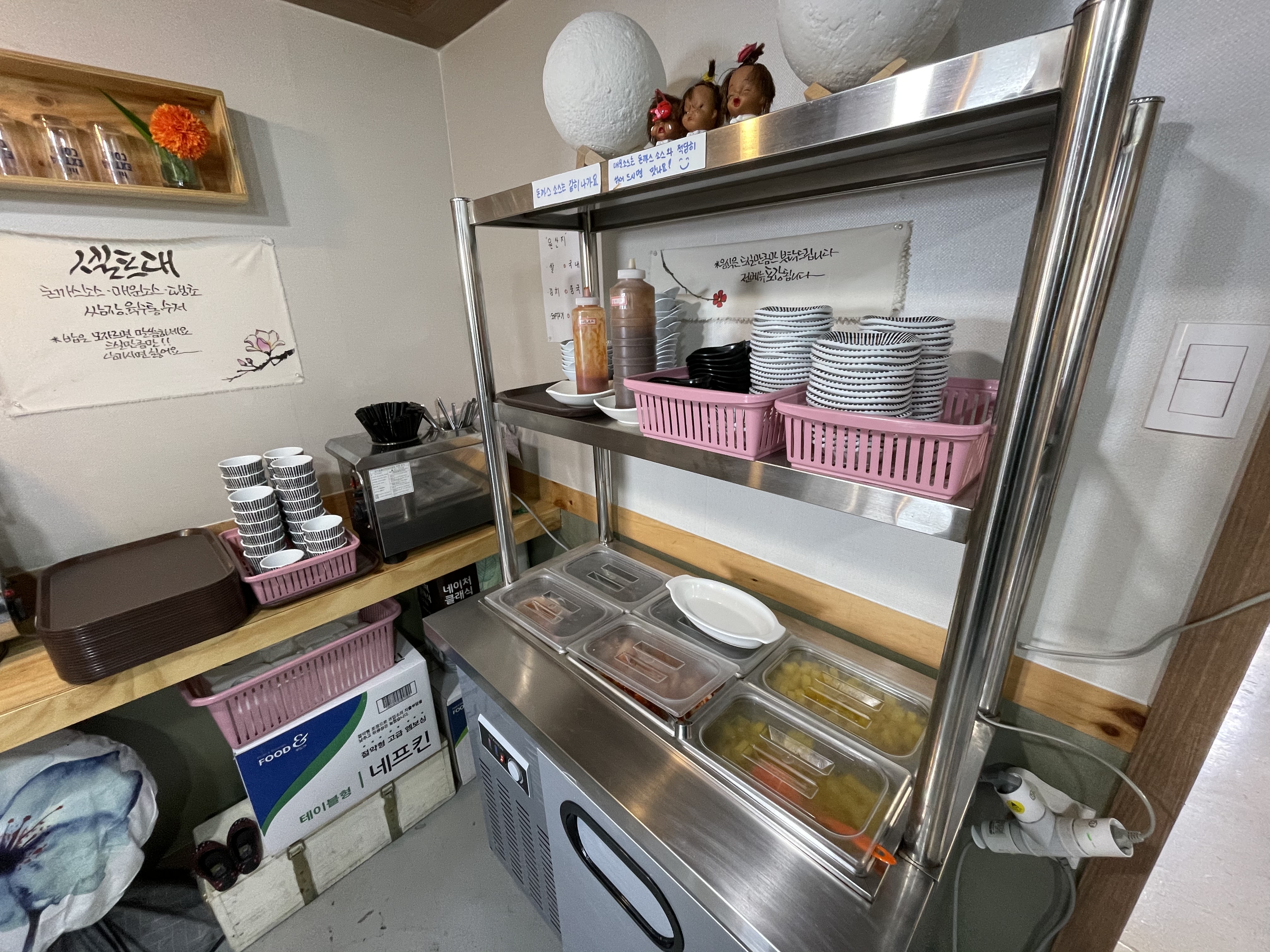 반찬을 다 먹었다면 식당 입구 왼편에서 리필할 수 있어요.