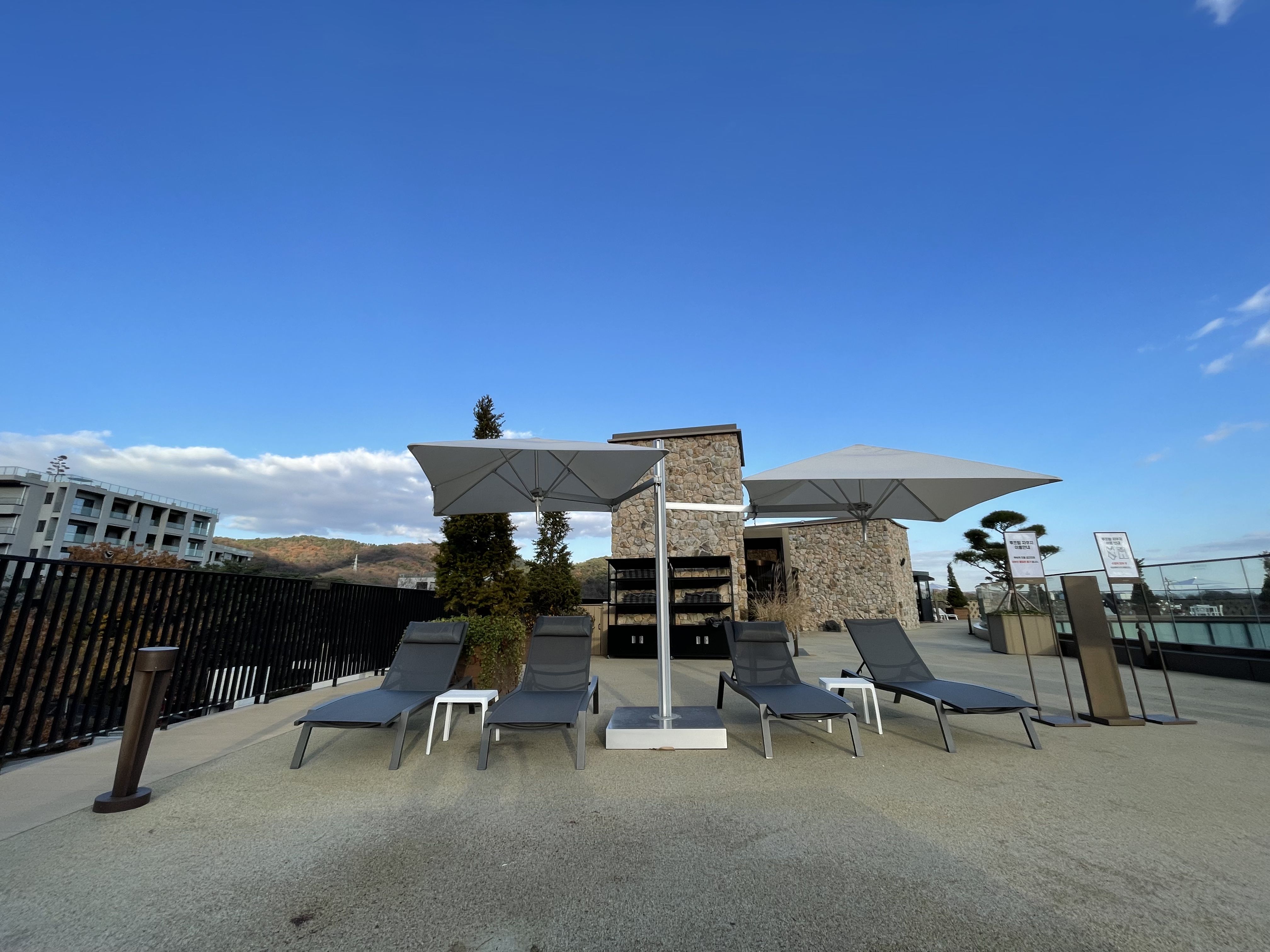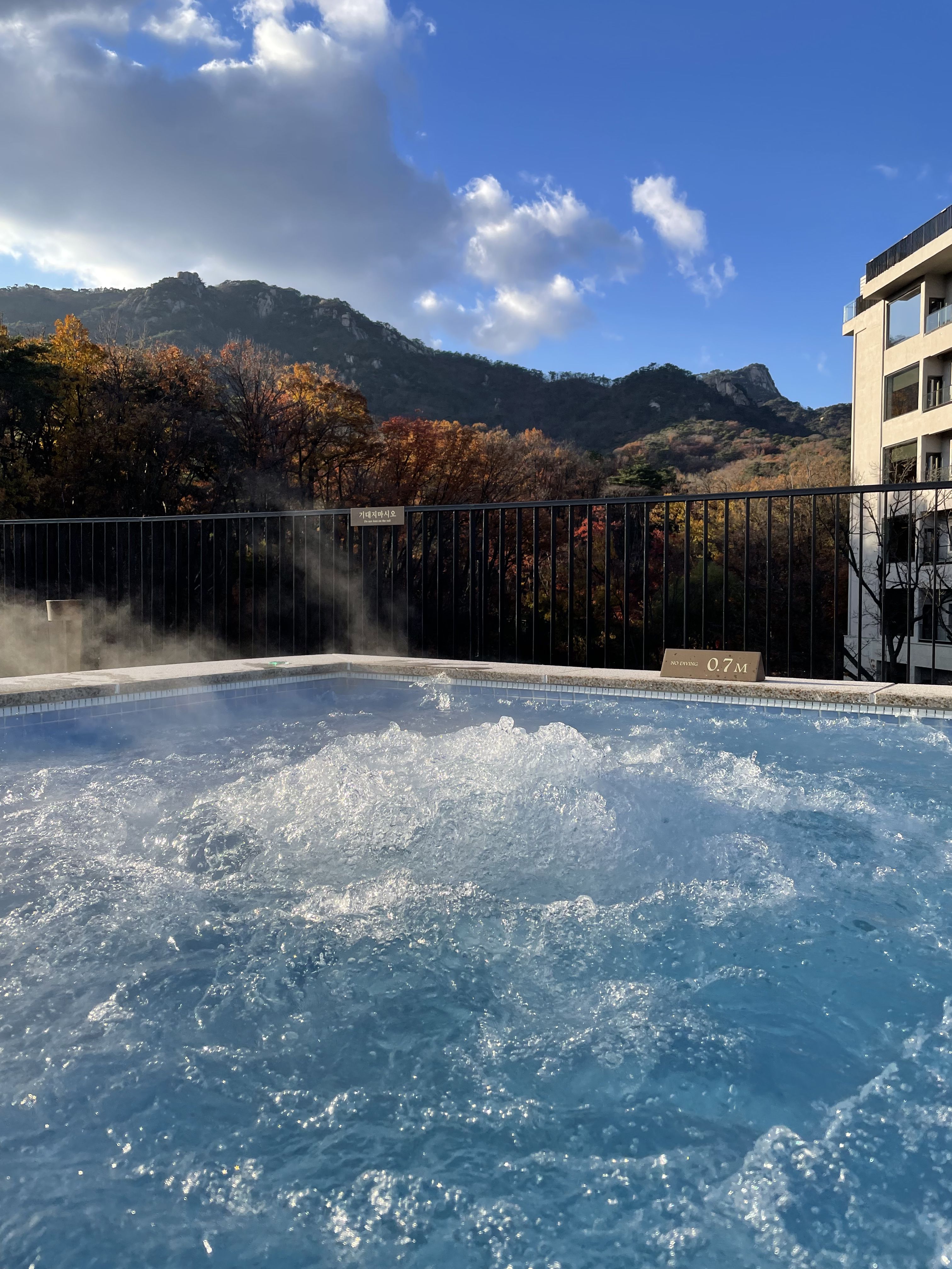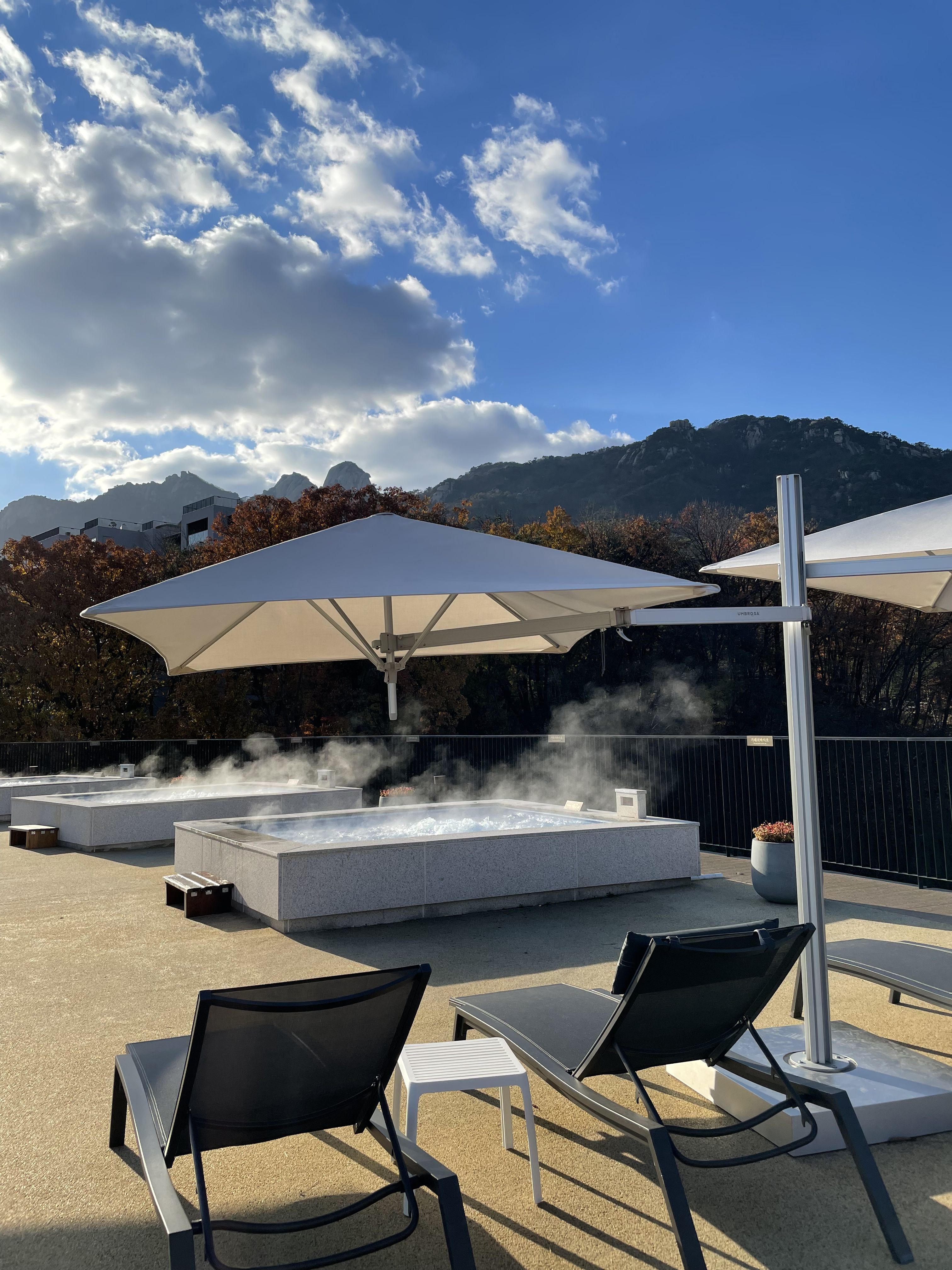 테라스 카페에서 에이드와 초콜릿을 맛있게 먹고, 방에서 옷을 갈아입은 후 테라스 카페 바로 옆에 위치한 루프탑 자쿠지에 왔는데요, 따뜻한 물속에서 마운틴 뷰를 감상하며 힐링할 수 있는 공간이에요.