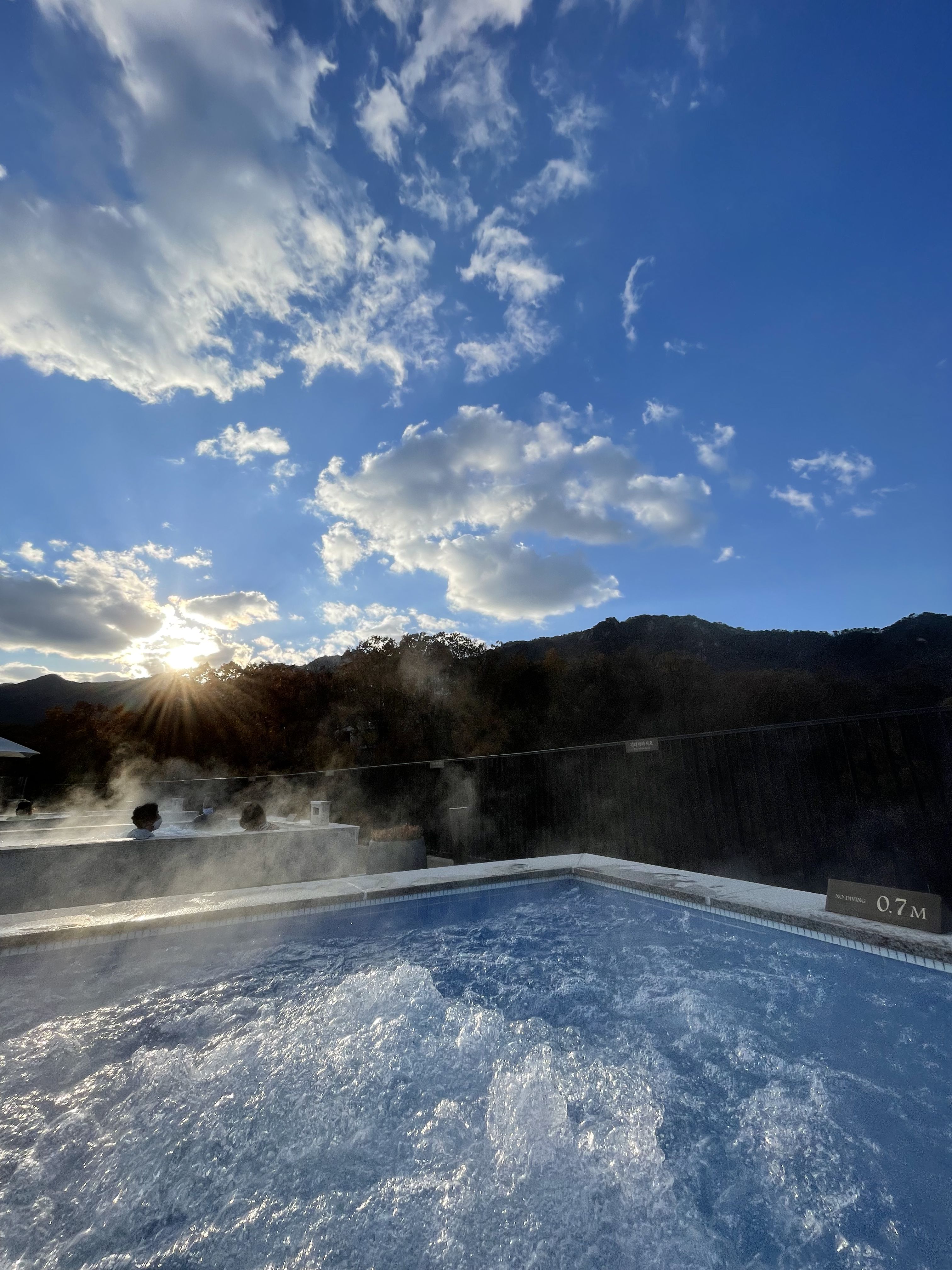 따뜻한 물속에서 산 너머로 해가 지는 모습을 보고 있으니 정말 힐링이 되는 기분이었어요.