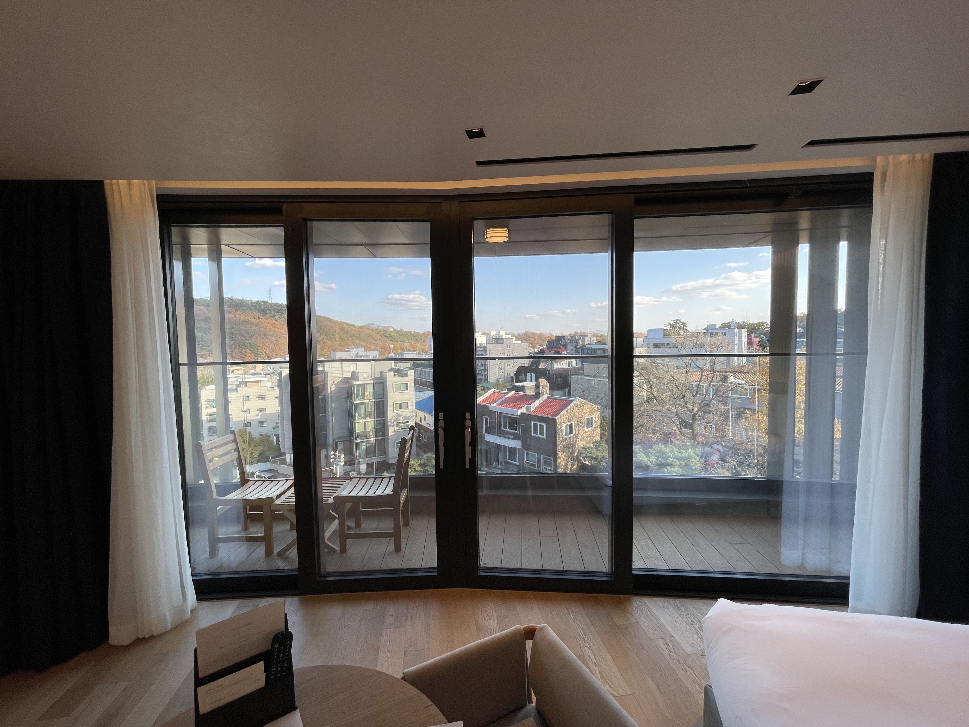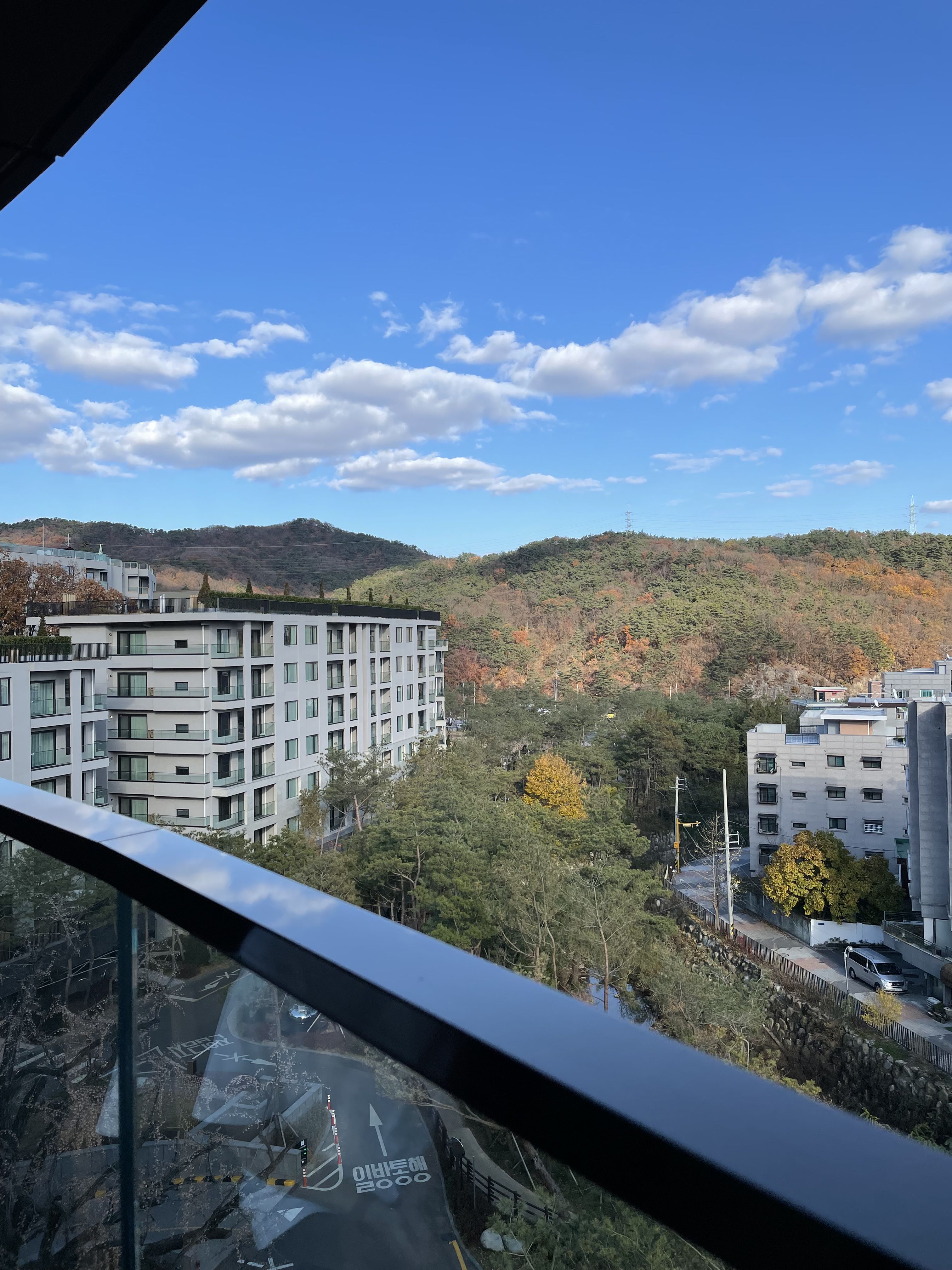 객실 구경을 다 하고, 테라스로 나가봤어요. 캐빈 주니어 객실은 파라스파라 서울의 객실 중 가장 저렴한 편에 속해서 북한산 절경을 볼 수 있는 뷰는 아니었지만 그래도 단풍이 물든 마운틴 뷰를 어느 정도는 즐길 수 있었어요.