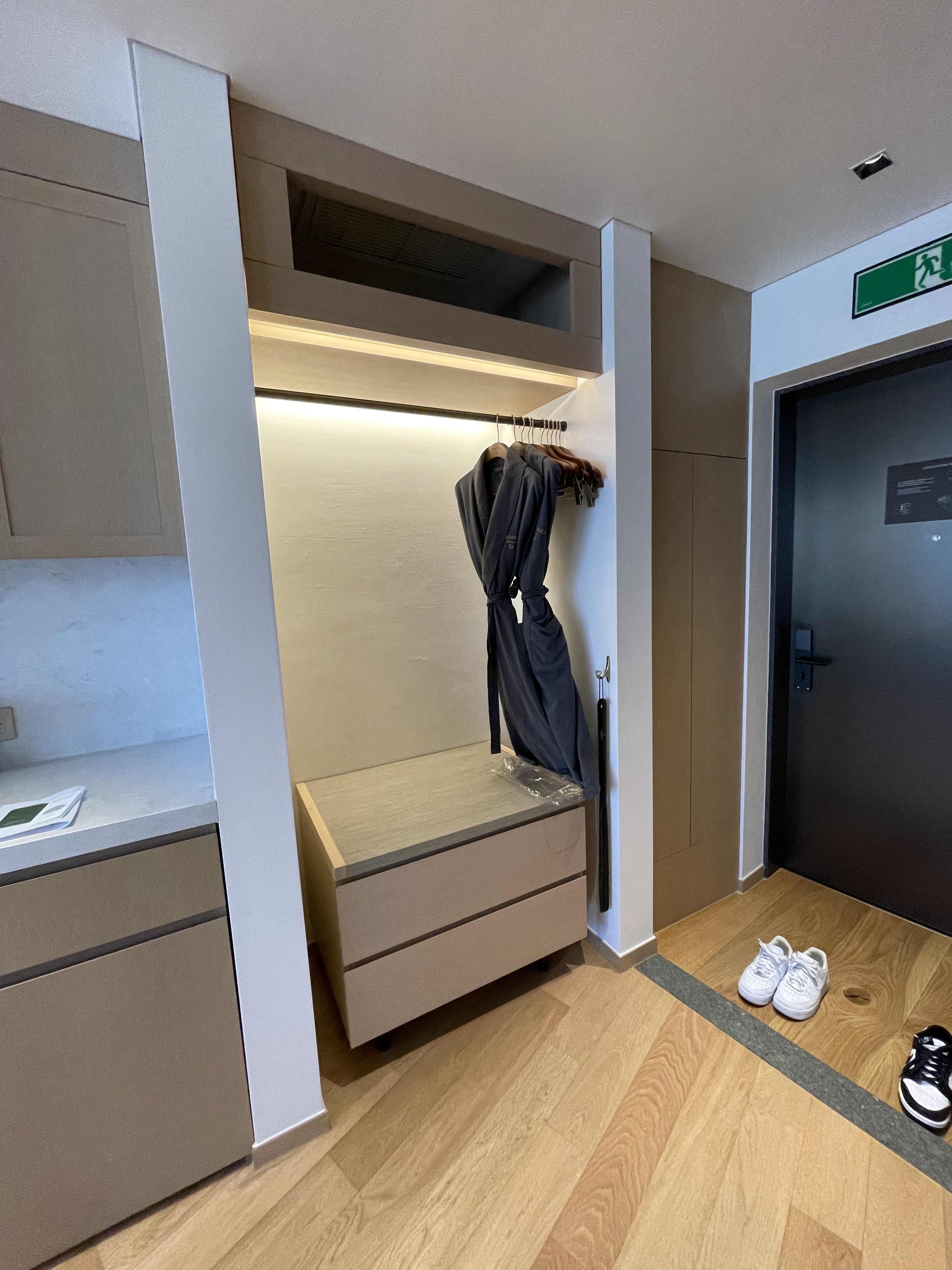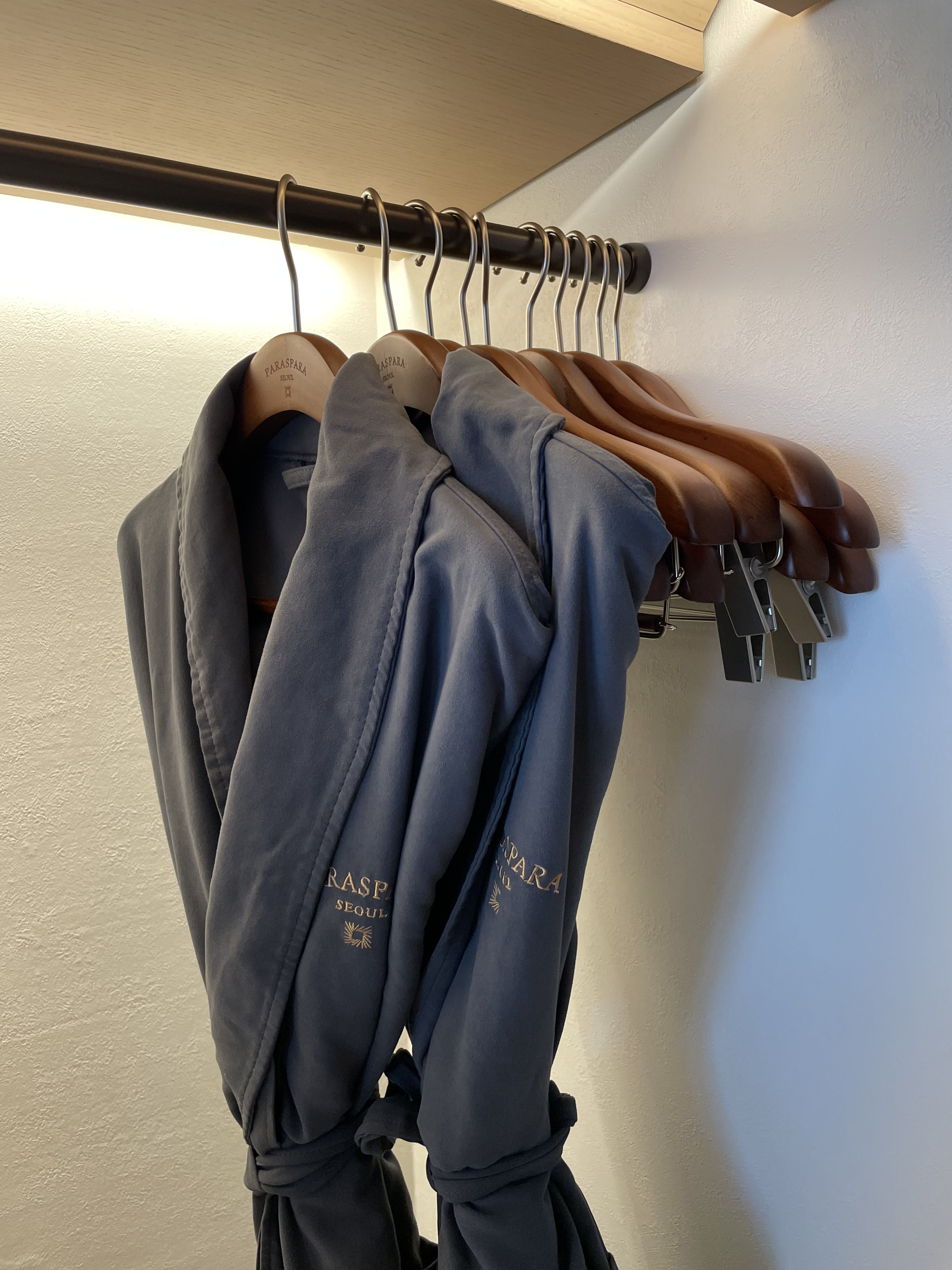 일단 객실 입구를 들어서면 오른편에 옷가지를 정리할 수 있는 옷장이 있어요. 그리고 샤워 가운이 걸려 있는데 114동 6층에 위치한 자쿠지로 갈 때 입고 갈 수 있습니다.