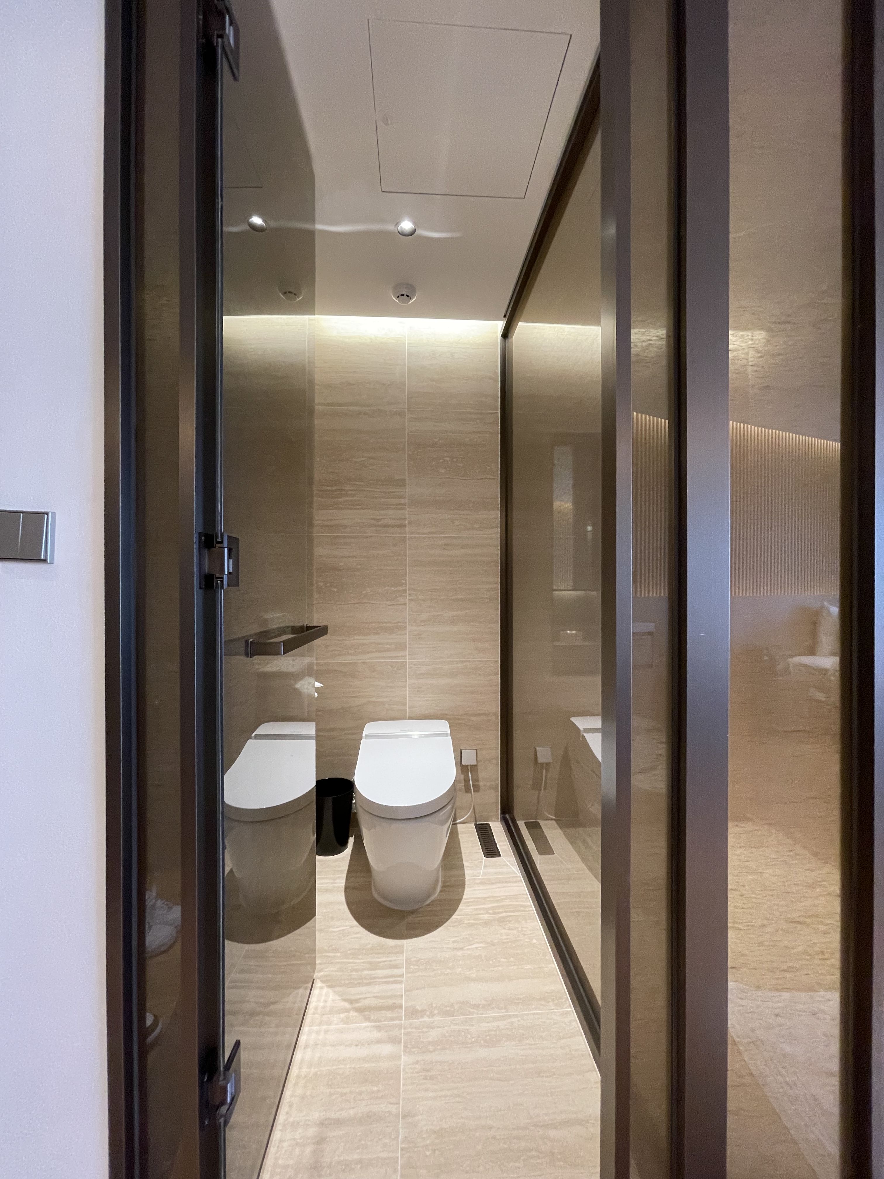 샤워실과 화장실 모두 반투명 유리로 되어 있어서 프라이버시를 지키기 어려운 점이 좀 아쉬웠어요. 화장실의 경우 내부에 블라인드라도 설치돼 있으면 어떨까라는 생각이 들더라고요.