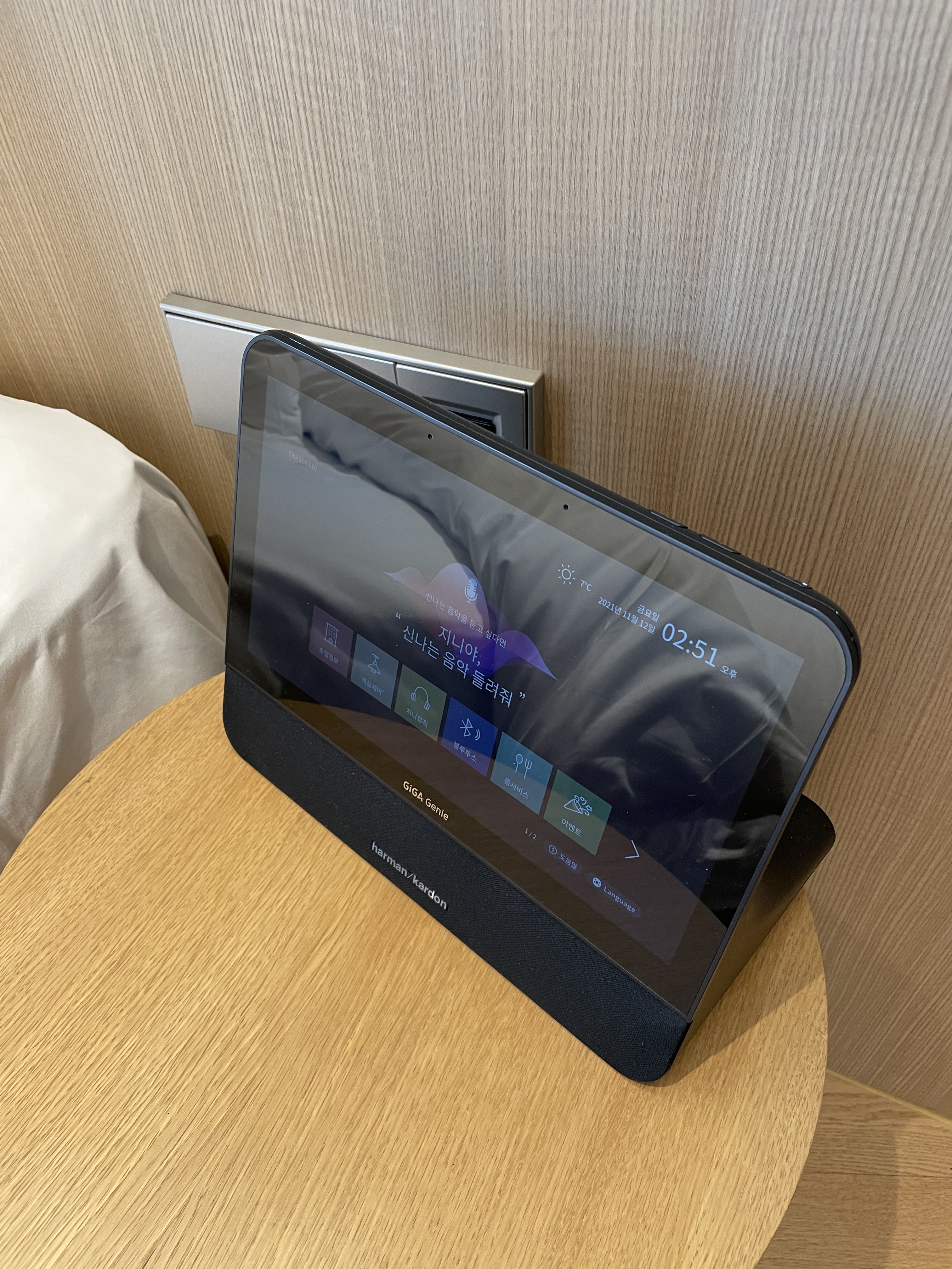 파라스파라 서울 캐빈 주니어 객실은 킹사이즈 침대가 1개 들어가 있는데요, 좌우 협탁에는 멀티 콘센트와 인공 지능 태블릿 지니가 설치돼 있어 객실 내 각종 시설을 음성 인식으로 컨트롤할 수 있어요. 다만 음성 인식이 그다지 정확하진 않아서 지니가 제 말귀를 잘 못 알아듣더라고요.