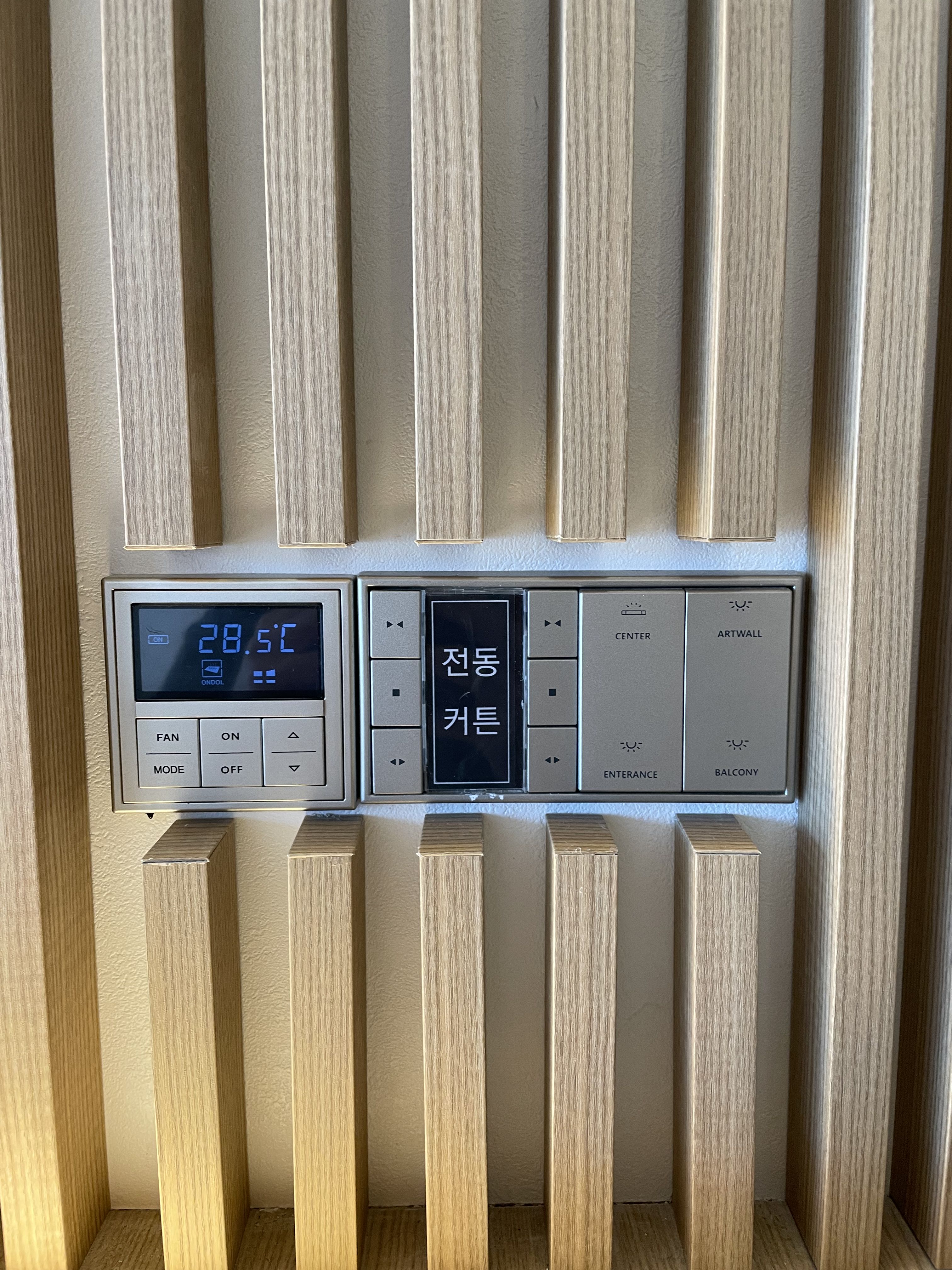 그리고 좀 아쉬웠던 부분이 객실 내 조명과 에어컨 등을 컨트롤할 수 있는 마스터 스위치의 위치였는데요, 이 스위치가 침대에서 좀 떨어져 있어서 조명이나 에어컨을 끄려고 하면 침대에서 일어나야 했기 때문에 좀 불편했습니다.