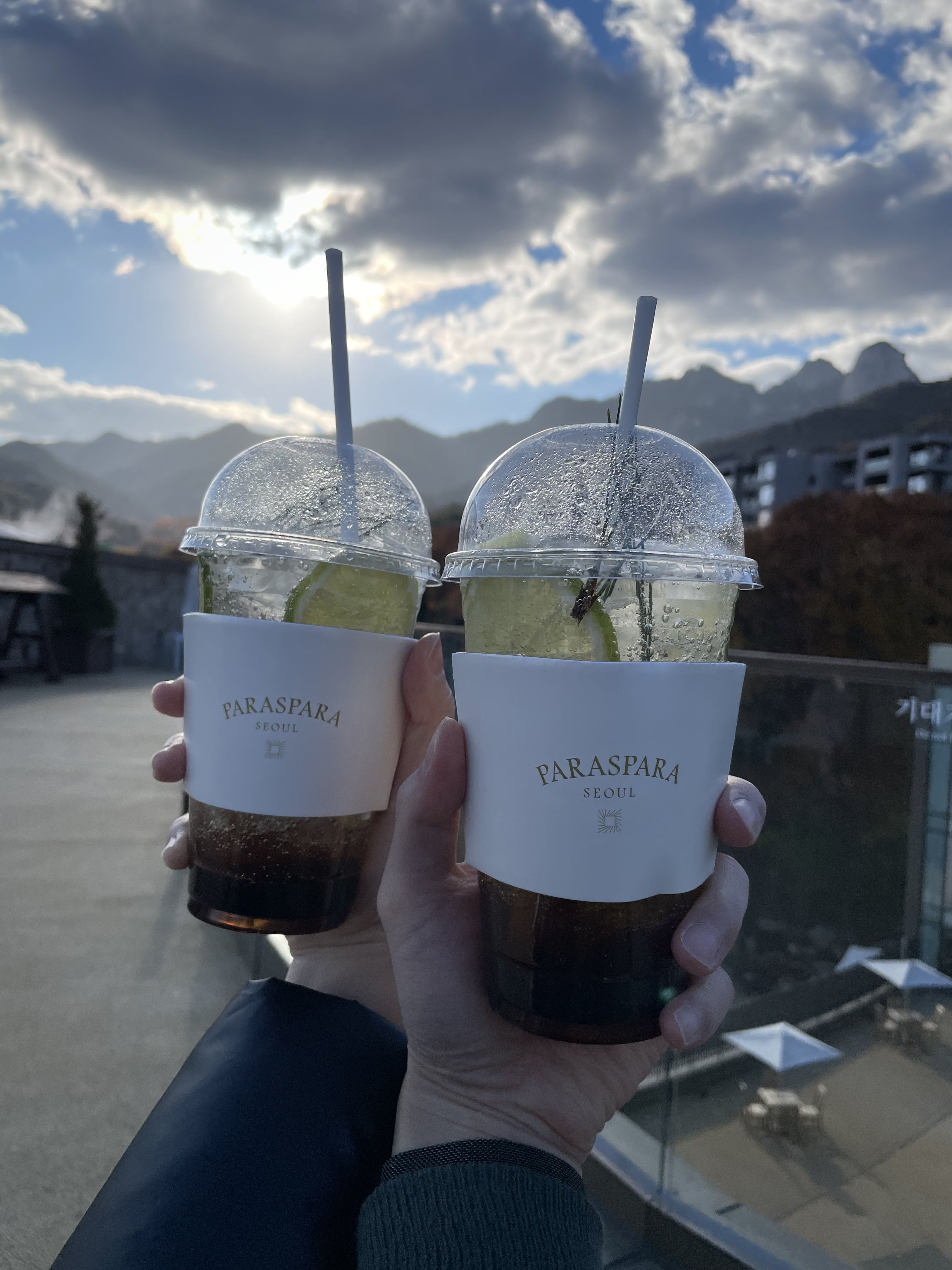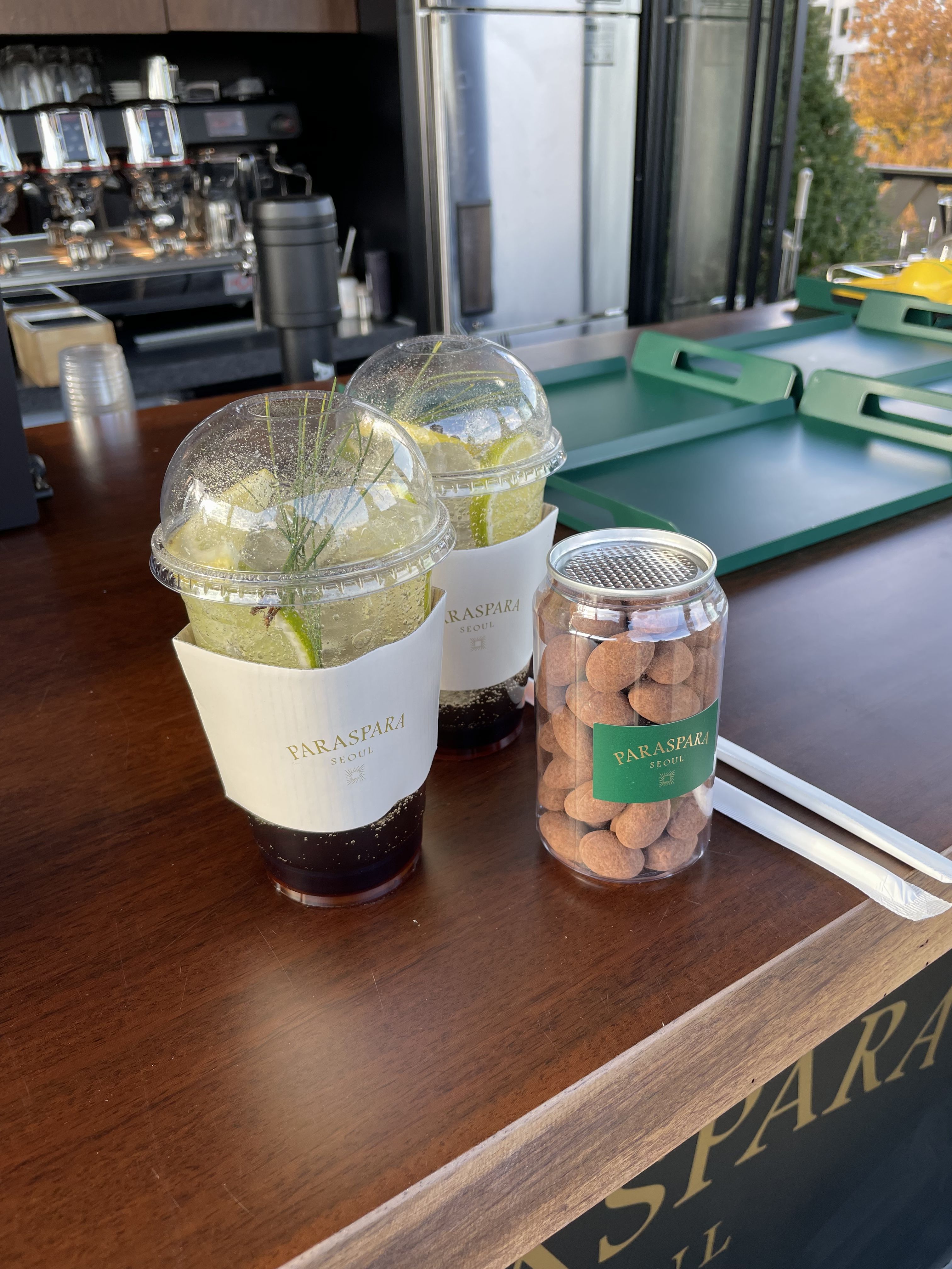 방에서 짐 정리를 다 하고 바로 6층에 위치한 루프탑으로 올라가 봤어요. 마이 파인 포레스트 패키지에 포함된 테라스 카페에서 파라스파라 시그니처 음료인 북한산 에이드와 드라제 초콜릿을 받아서 먹었어요.