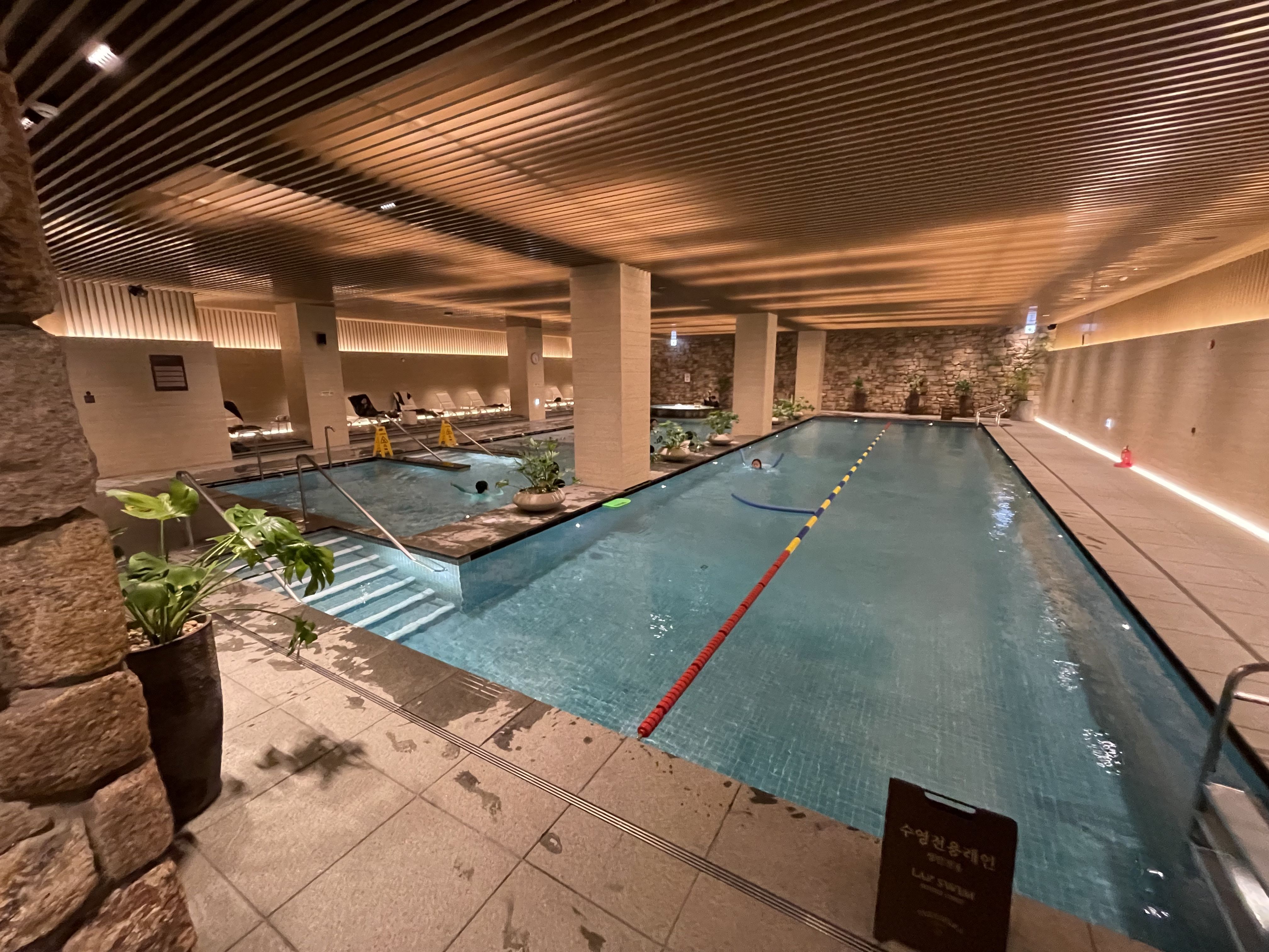 1층 수영장도 꽤 큰 규모였는데요, 하나의 레인 수영장과 키즈 수영장으로 구분되어 있었어요. 파라스파라 서울 실내 수영장은 현재 코로나19 단계적 일상 회복에 따라 백신 2차 접종 완료 혹은 48시간 이내 PCR 검사 확인증이 있어야 입장 가능해요.