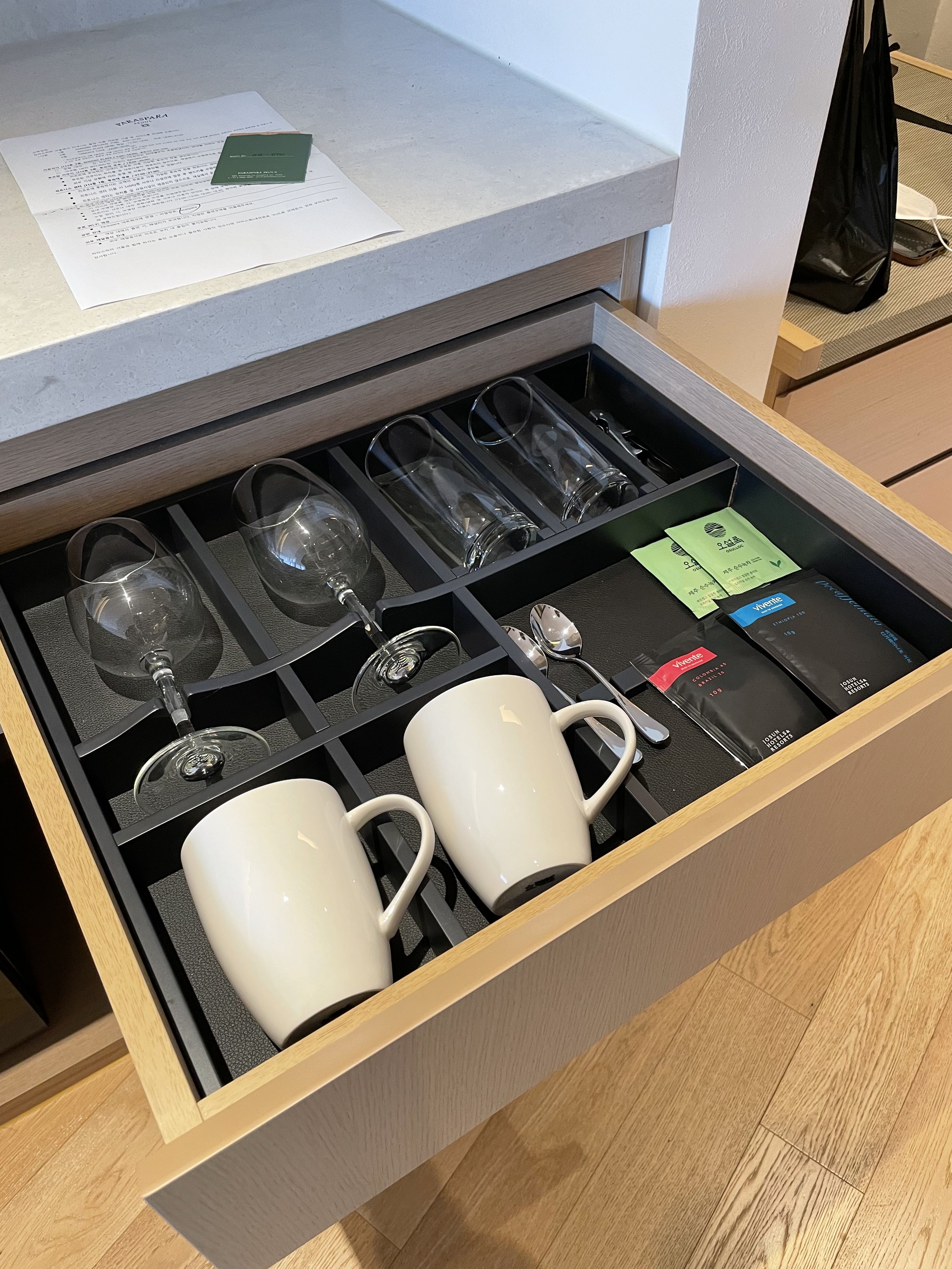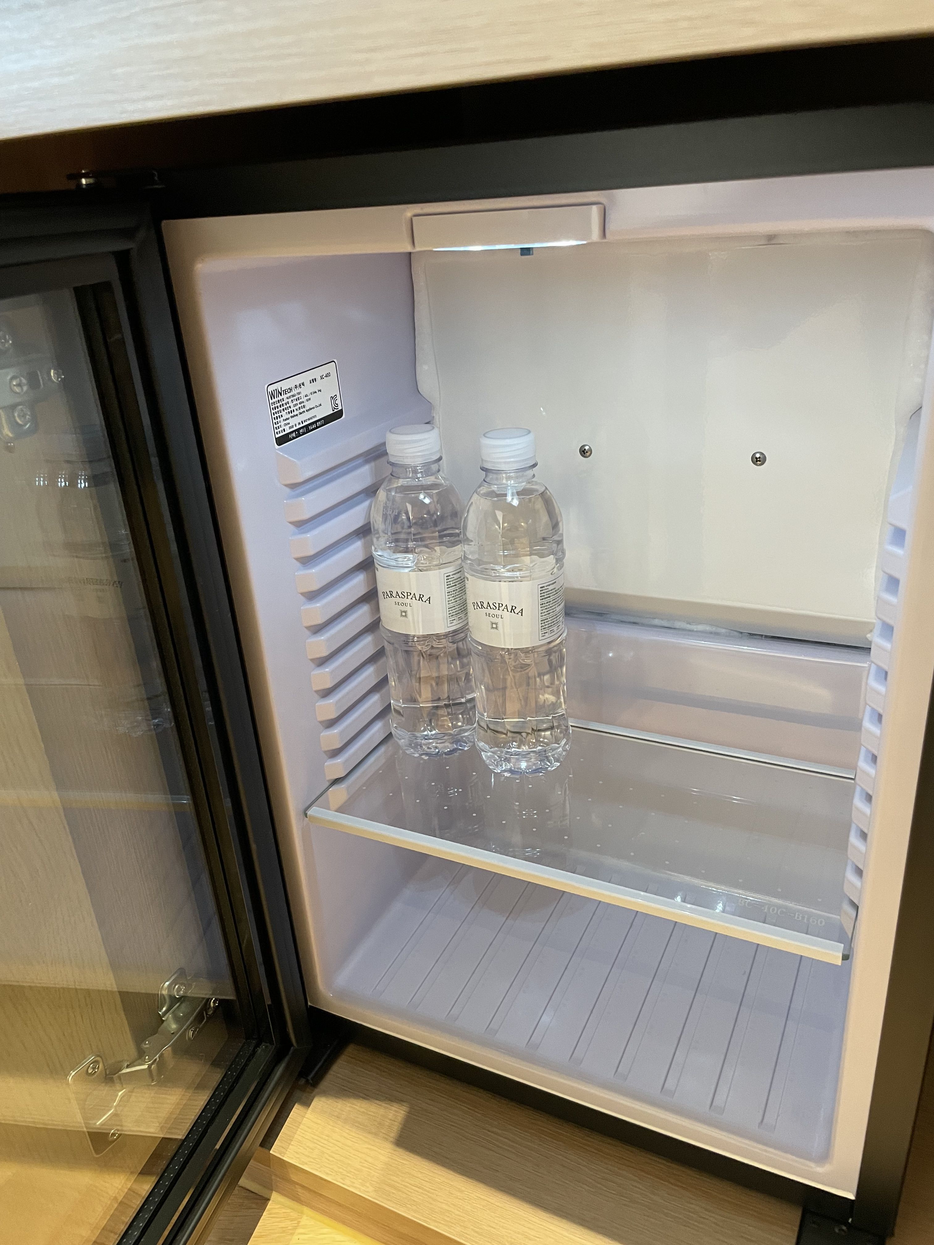 옷장 바로 왼편에는 커피 포트와 각종 식기들 그리고 미니 냉장고가 있었어요. 미니 냉장고에는 생수가 두 병 들어가 있었는데 냉장고 자체의 온도가 별로 시원하지 않은 느낌이었어요. 온도를 조절할 수 있는 장치도 없더라고요.