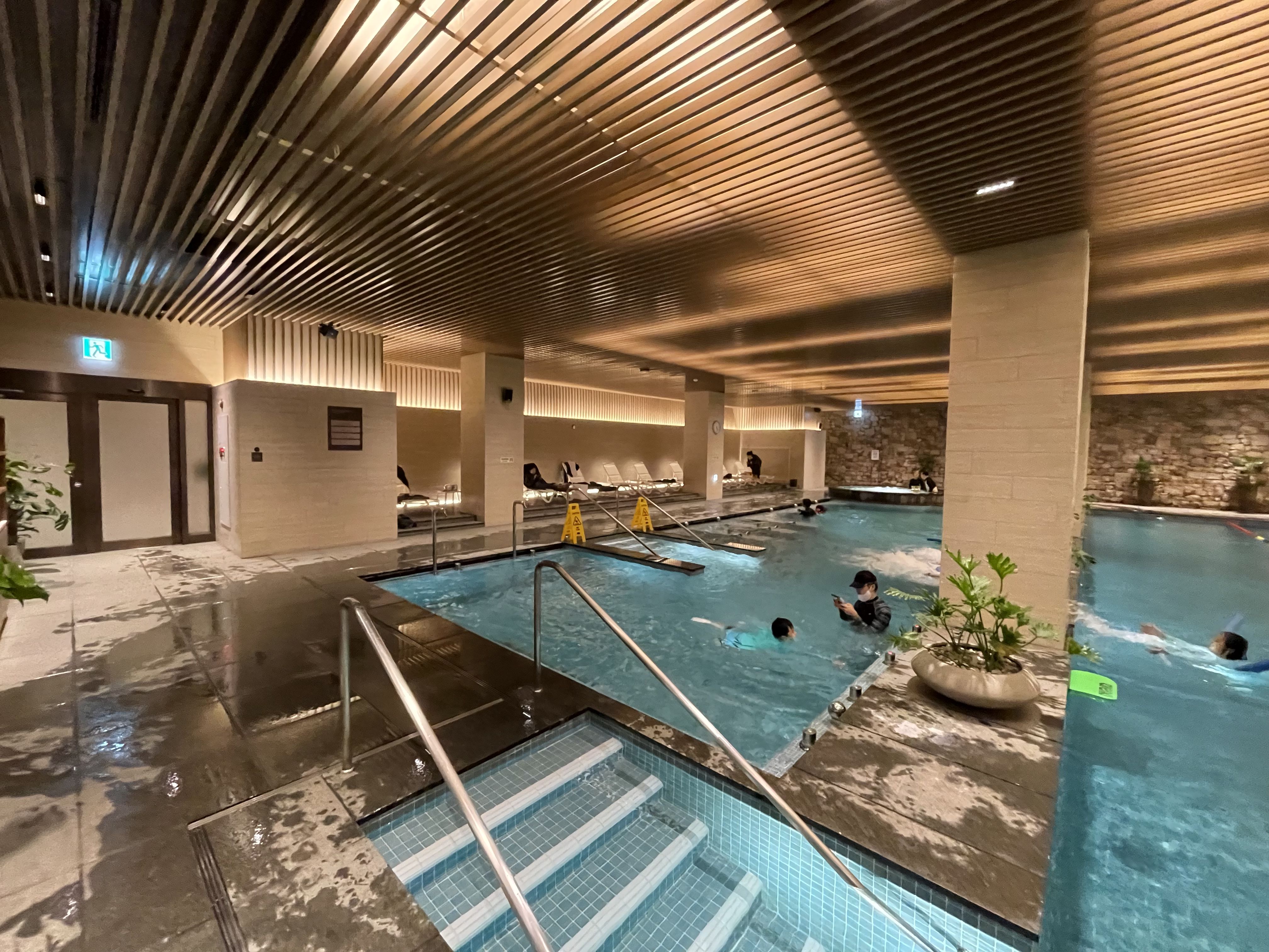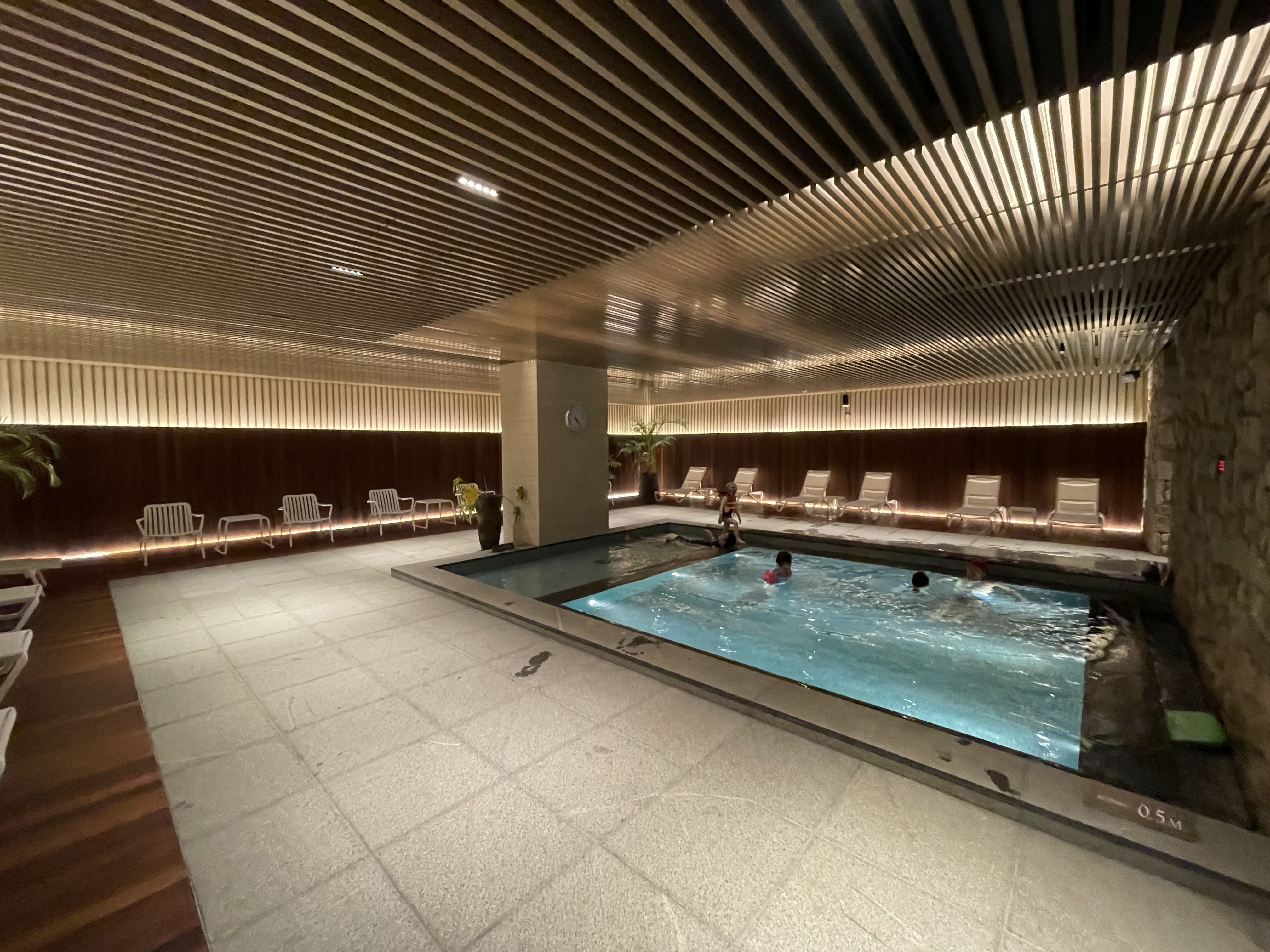 해가 뉘엿뉘엿 지더니 좀 추워져서 1층 실내 수영장으로 이동했어요. 평일이라 그런지 가족 단위의 손님들이 대부분이더라고요.