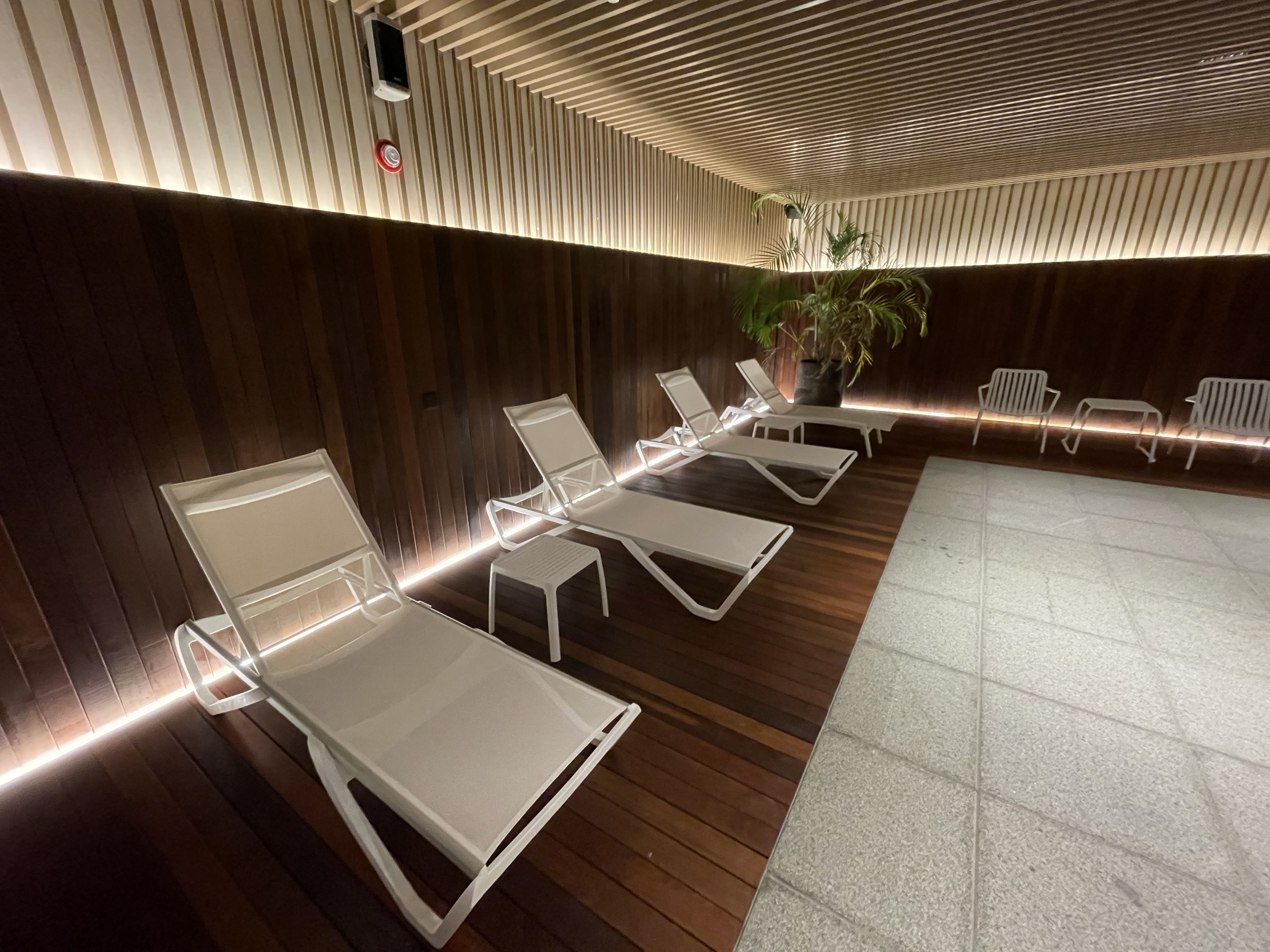 114동 1층 정문을 들어서면 왼편에 체크인을 위한 리셉션이 있고, 중앙에는 쉴 수 있는 라운지 공간이 마련되어 있어요. 그리고 부대시설 중 실내 수영장과 사우나가 114동 1층에 위치해 있습니다.