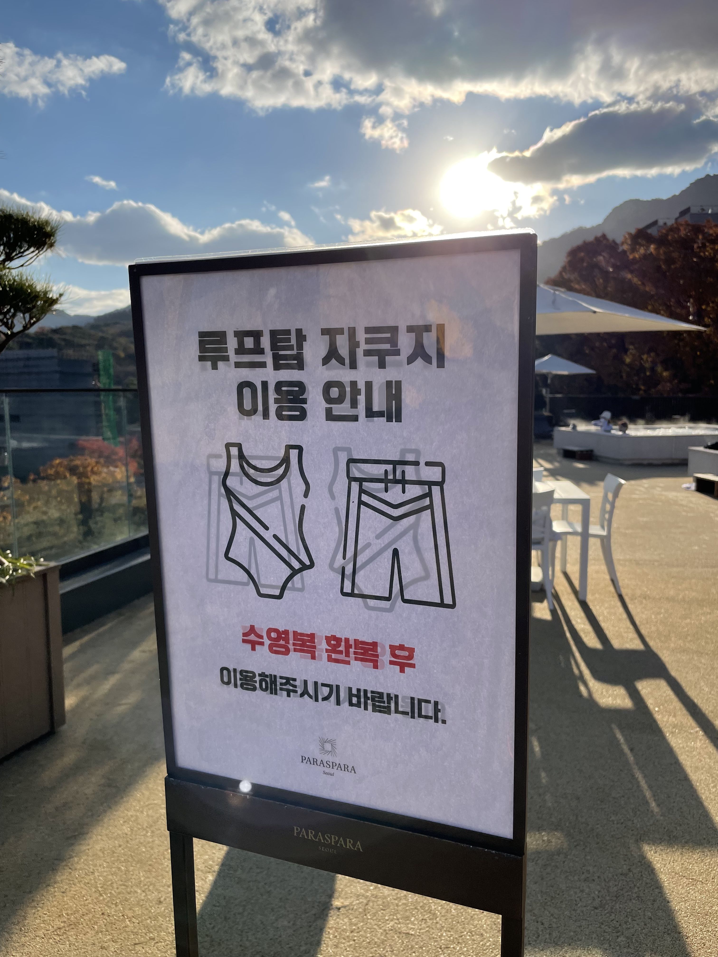 루프탑 자쿠지는 반드시 수영복을 착용한 후 이용할 수 있기 때문에 객실에서 수영복 환복 후 샤워 가운을 걸치고 오면 됩니다.