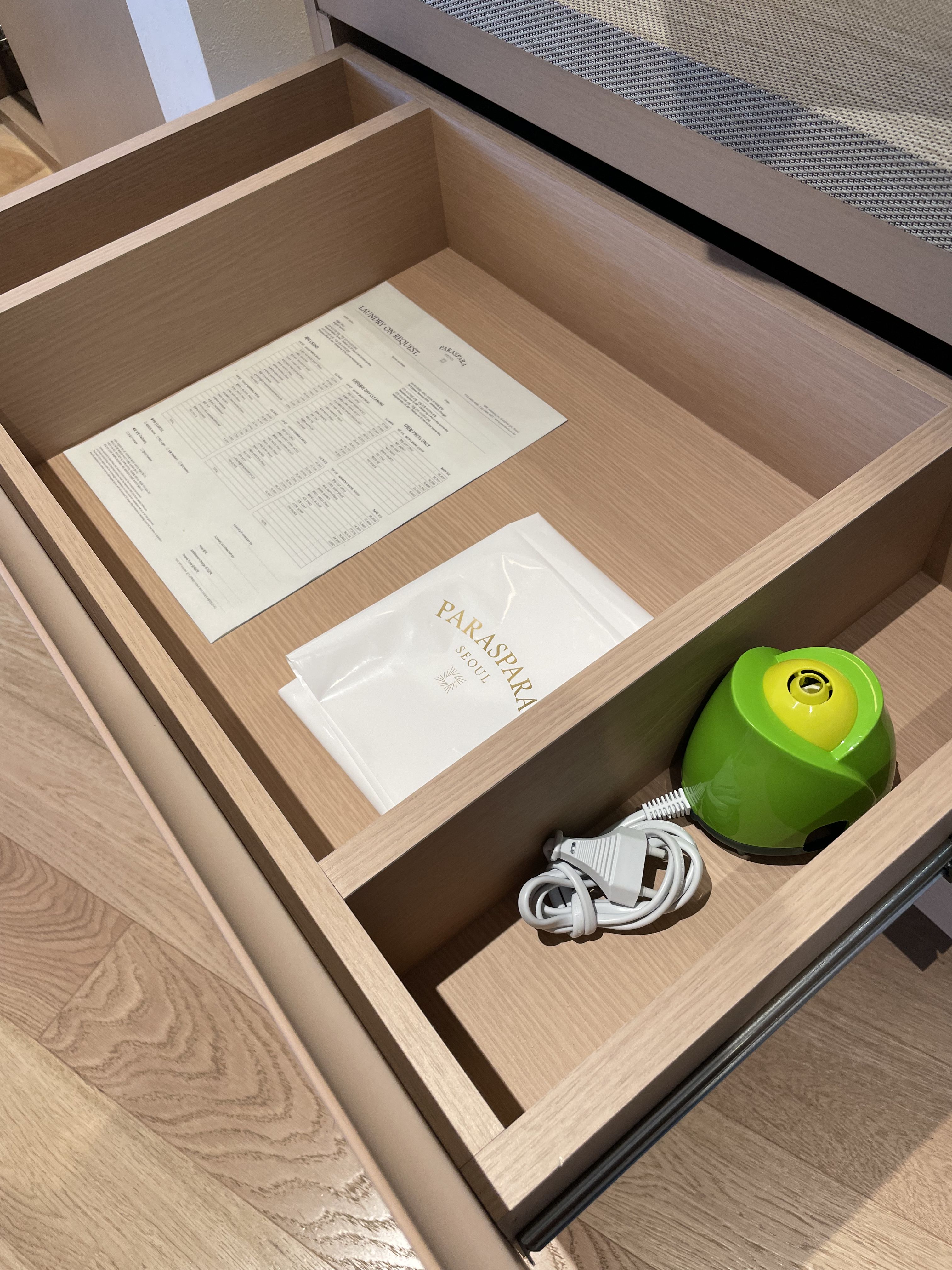옷장에는 옷걸이가 많이 걸려 있는데요, 항상 호캉스를 가면 옷걸이가 부족하다는 느낌을 받았었는데 파라스파라 서울에서는 옷걸이가 충분해서 여유있게 옷을 정리할 수 있었어요.