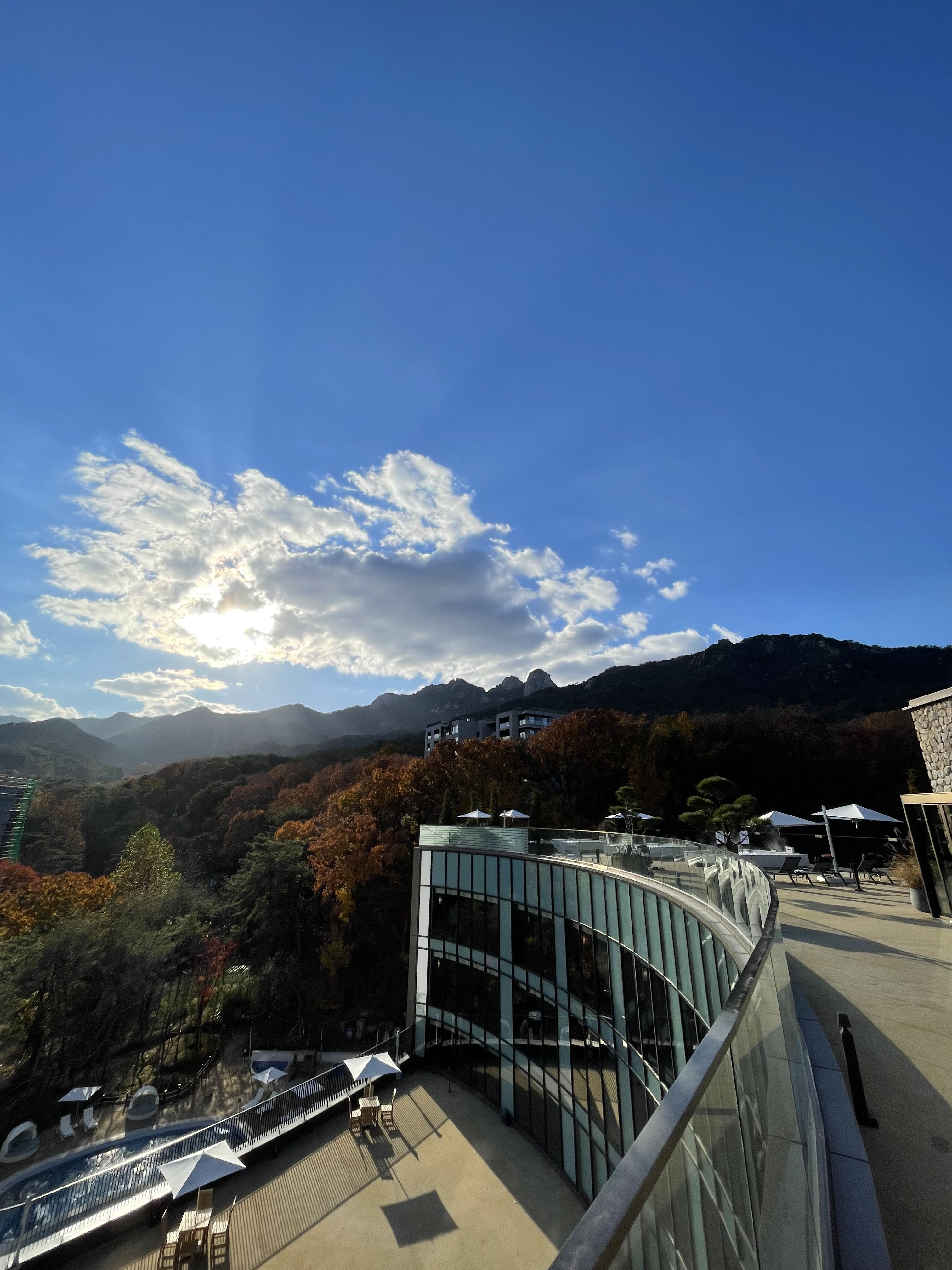 객실 구경을 다 하고, 테라스로 나가봤어요. 캐빈 주니어 객실은 파라스파라 서울의 객실 중 가장 저렴한 편에 속해서 북한산 절경을 볼 수 있는 뷰는 아니었지만 그래도 단풍이 물든 마운틴 뷰를 어느 정도는 즐길 수 있었어요.